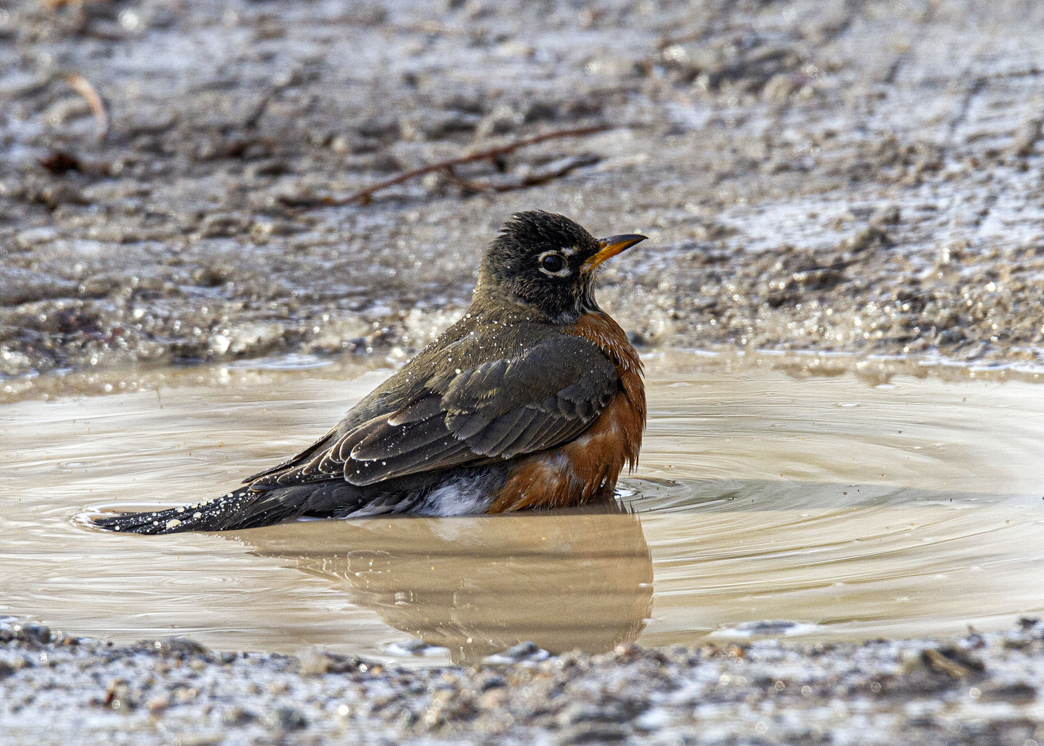 Last week at Occoquan Bay National Wildlife Refuge I spotted a small group of American Robins (Turdus migratorius) clustered around a large puddle. Some of the birds took their turns drinking from the puddle, while others took advantage of the opportunity to take a bath. Some of the birds merely flapped about a bit in the water, but the robin in the photo below seemed to enjoy soaking in the cold water.