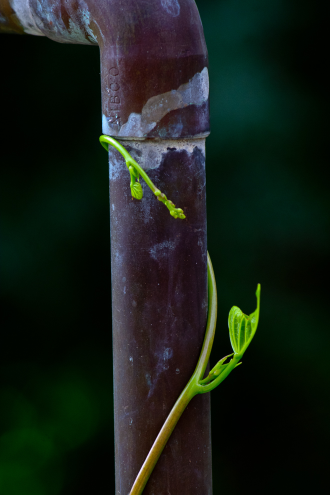 I was leaning over the green-colored pond water, gazing at a distant dragonfly when I happened to glance down to my right. There, almost camouflaged in what my friends say is duckweed, was a semi-submerged frog. I was able to get my camera’s lens down pretty low and got in close and captured an image I really like. The frog’s gold-ringed eyes shine out clearly amidst all of the individual particles of duckweed that cover much of his expressionless face.