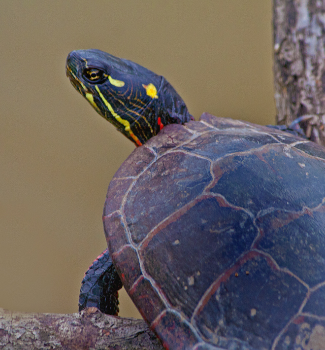 What do turtles think about? When I came upon this red-eared slider turtle (Trachemys scripta elegans), that was my first thought. Perched at an angle on a branch, the turtle seemed to be lost in contemplation. His eyes looked out over the expanse of brown, muddy march water, but he seemed inwardly focused.