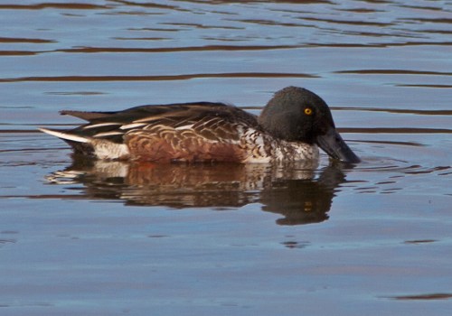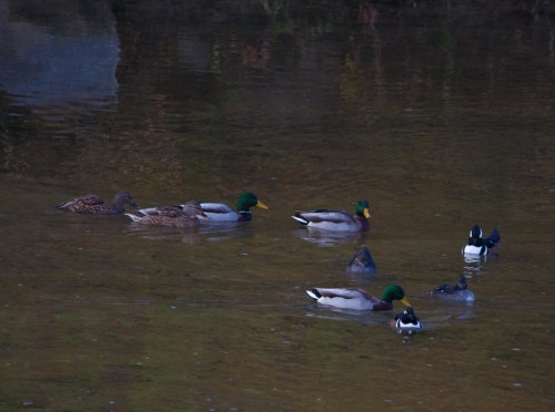 At the same time, four Hooded Merganser ducks (Lophodytes cucullatus), two males and two females, were headed downstream in perfect formation on a collision course with the Mallard ducks.