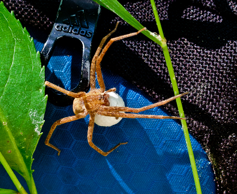 As I was reaching for my camera bag after taking a photo of a spider, I was surprised to see an unexpected visitor—a much larger spider with what looks like an egg sack.