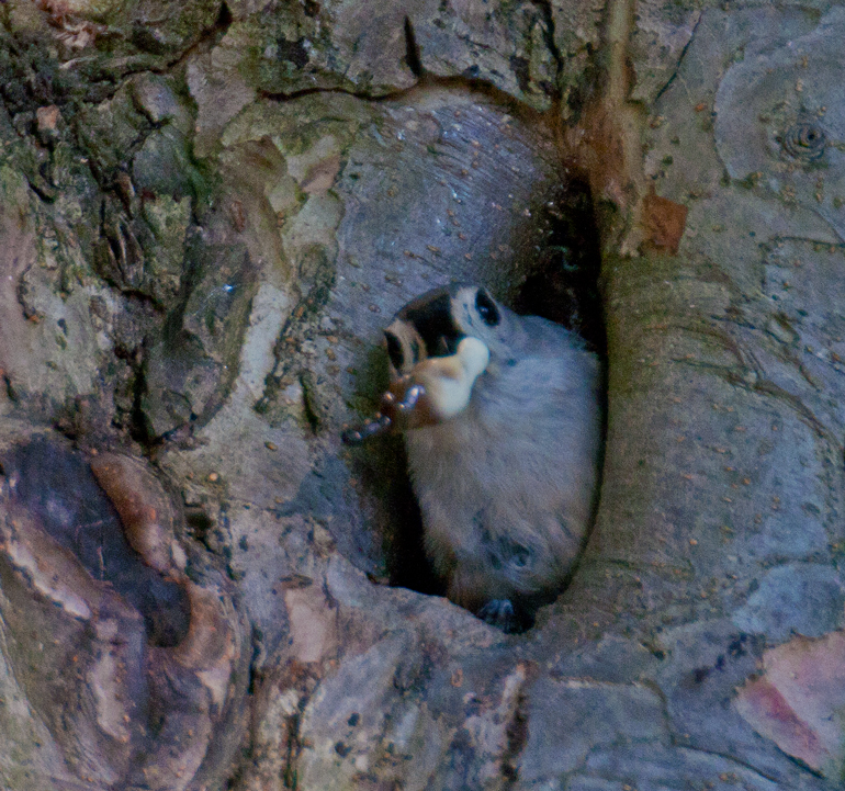 Earlier in the week another neighbor had alerted me that there were baby birds in a tree a few doors down from my townhouse. I live in a suburban townhouse community and each of us has a postage-stamp size front lawn and a mandatory tree, mostly small crab apple trees. The baby birds were in a cavity of one such tree, a mere two feet (60 cm) above the ground and there seemed to be three or four babies.