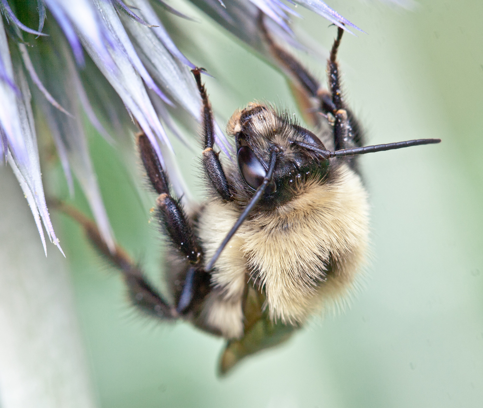 Before going out to the marsh park to shoot this morning, I decided to check out my neighbor’s garden and came across this bumblebee, hanging from the side of a a beautiful Small Globe Thistle (Echinops ritro).