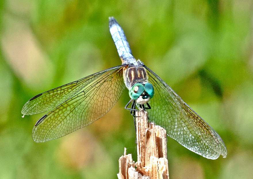 I have been having some difficulties identifying this dragonfly. The coloration of the tail looks a little like a female Blue Dasher, but the beautiful blue eyes do not seem right for the female. The tip of the tail should be a help, but I can’t seem to find one that matches it.
