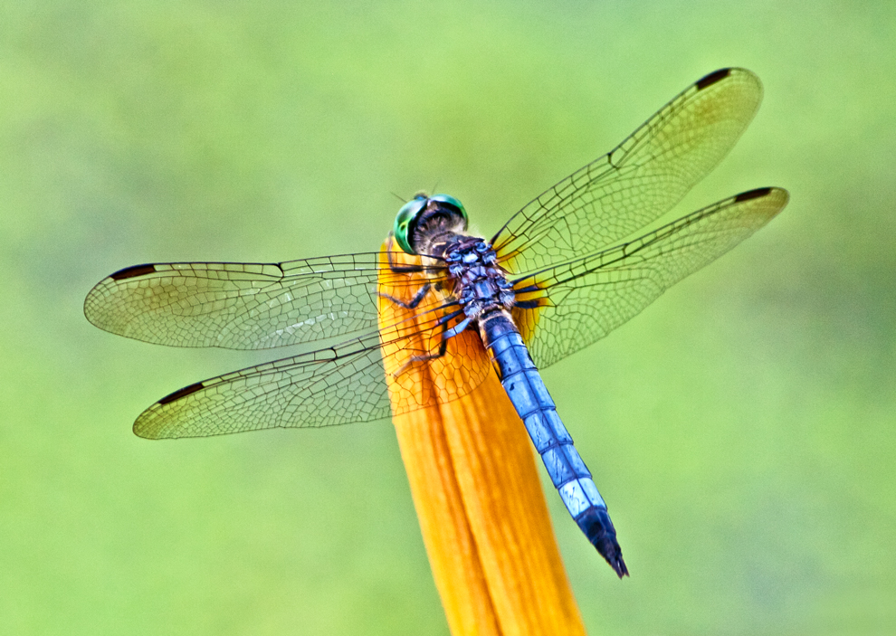The green of the background complements the blues of the dragonfly, but it is the orange that makes this image pop for me.