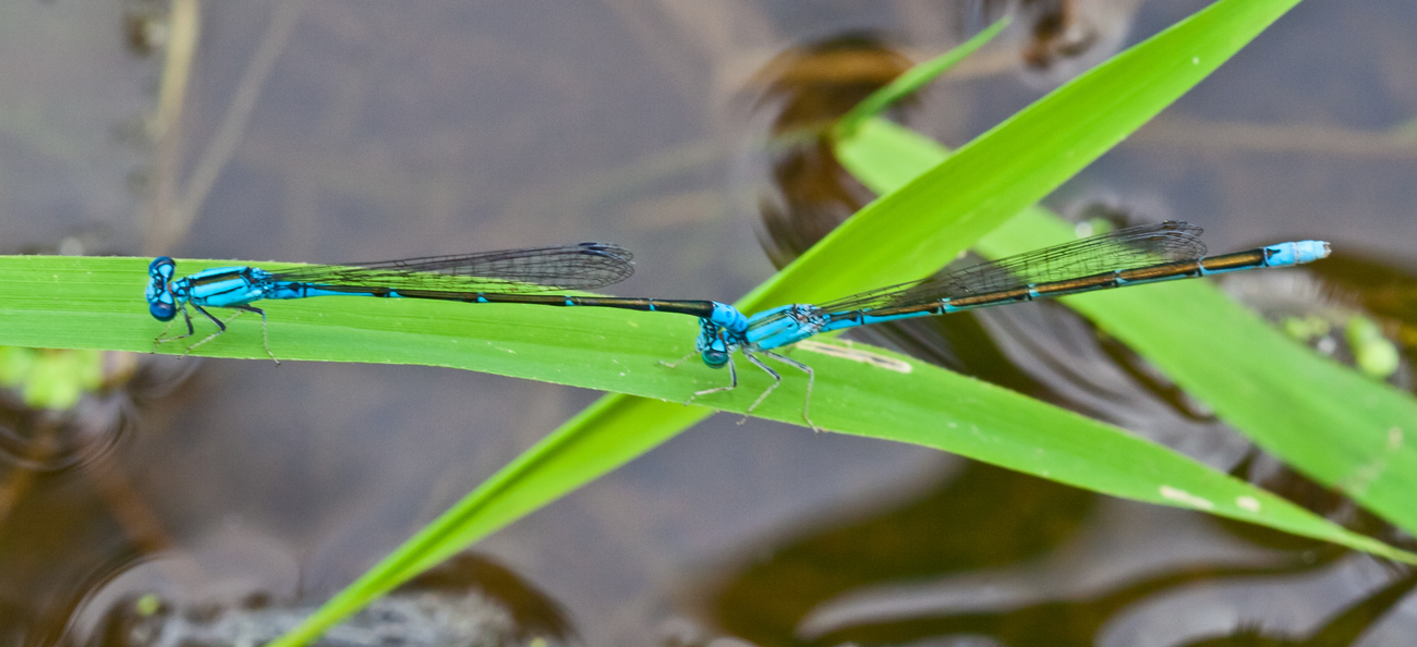 Damselflies have such narrow bodies that it’s often hard for me to get my camera to focus on them, but I love to chase after them, hoping to capture some of their beautiful colors. I was happy that I managed to get this shot of mating damselflies with enough detail to see some of the differences in coloration between the male and the female. I don’t dare try to explain the physiology of the mating process—I don’t really understand it and will leave that to the experts.