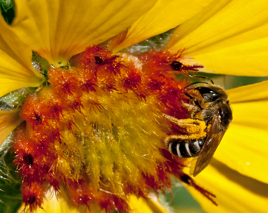 One of the first rules of photography that I learned was the importance of keeping a subject’s eye in focus and I managed to accomplish that with this bee that I photographed yesterday. However, the depth of field turned out to be so shallow that only a few other parts of the bee are as precisely focused as the eye.