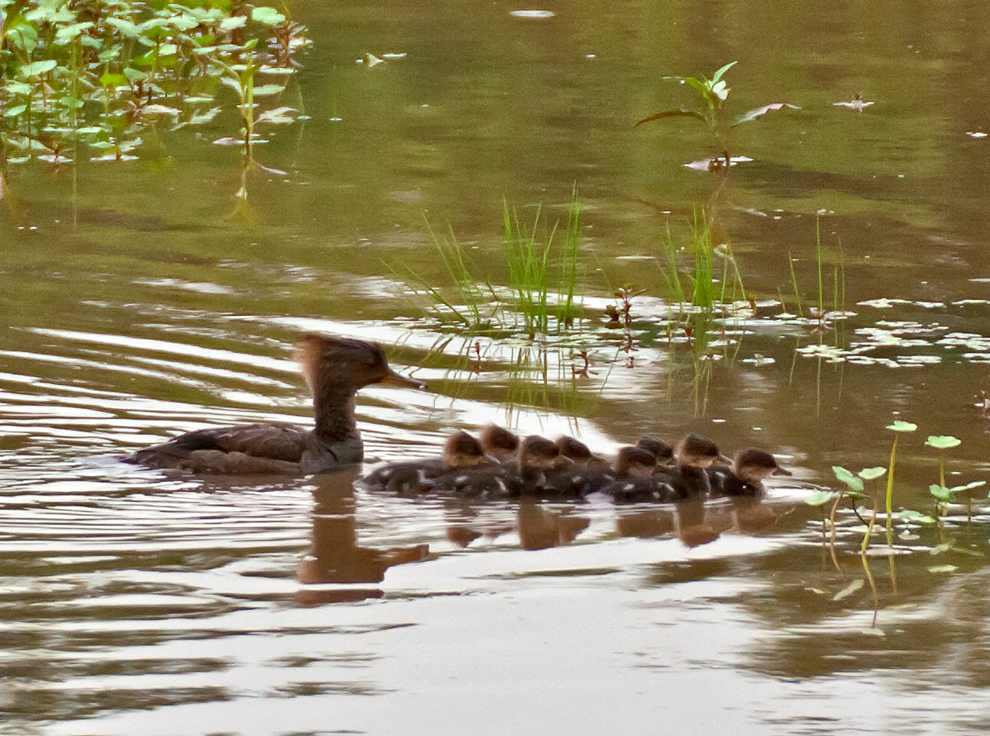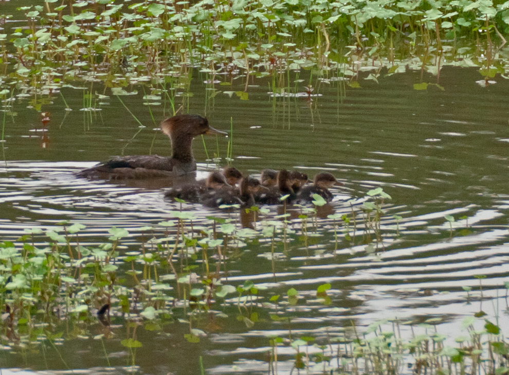 Walking along the boardwalk at my local marsh yesterday morning, scanning the surface of the water, I noticed some movement and suddenly a female Hooded Merganser (Lophodytes cucullatus) with eight little ducklings swam into view. They were pretty far away in the shallow water, amidst the plants that have sprung up, but I managed to get a few shots of the family. The female Hooded Merganser ducks cares for the young alone, unlike the Canada Geese families that I see at the marsh, in which both parents are present.