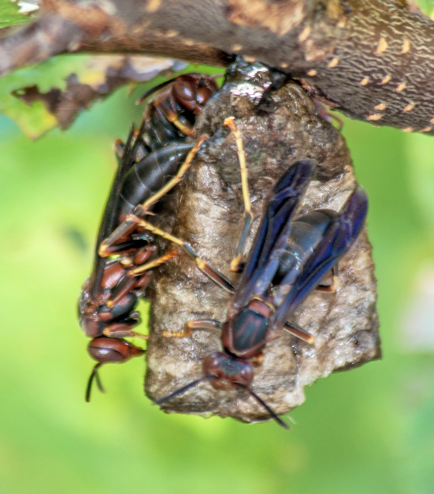 What had I gotten myself into? It turns out that my fears were greatly exaggerated and the nest was a very modest one, not much bigger than the wasps themselves. My fellow photographer had been told that they are paper wasps and it looks to me like they may be brown paper wasps, judging from some of the photos that I have seen on-line.