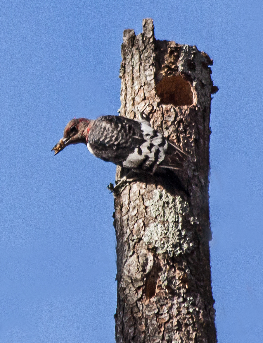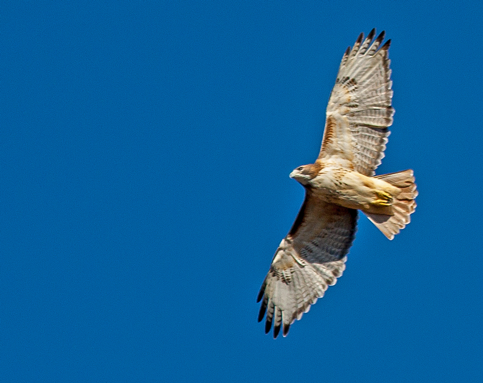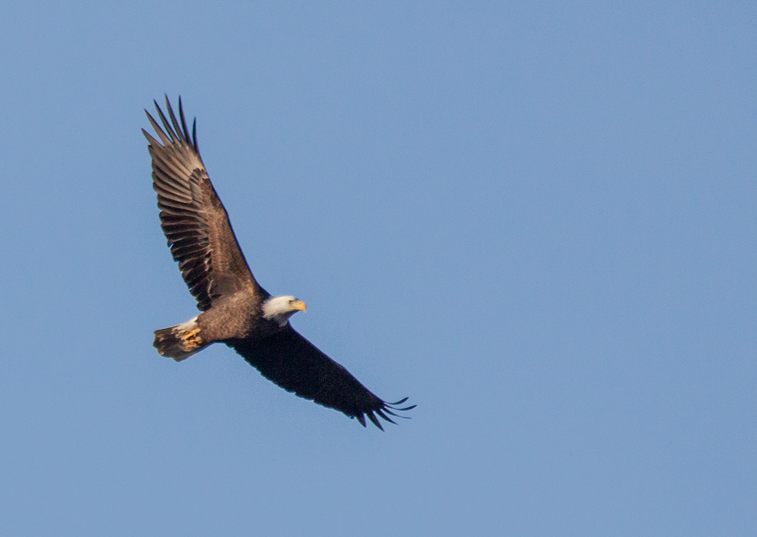 In some ways, it’s a little easier to track a bird in the sky, since there is nothing else to grab the camera’s focus (if you can lock in the focus quickly enough). However, the light is a lot more variable, particularly when a bird is circling, so proper exposure is a challenge and shadows are a sad reality. I was happy that I was able to time the second shot so that the light illuminated most of the underside of the goose. Some photographers, though, seem to look down at photos of birds in the sky and prefer more environmental shots.