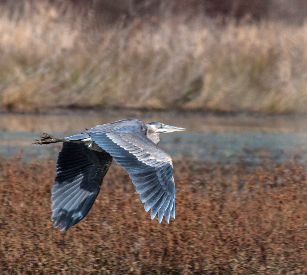 I had to act quickly to get the shot of the goose with the trees in the background, when some geese took off and flew by me at almost eye level. The trees were far enough away that they blurred out and the head of the goose is mostly in focus. Depth of field is always an issue for me in shots like this—you can actually see the depth of field in the amount of the extended wings that is in focus.