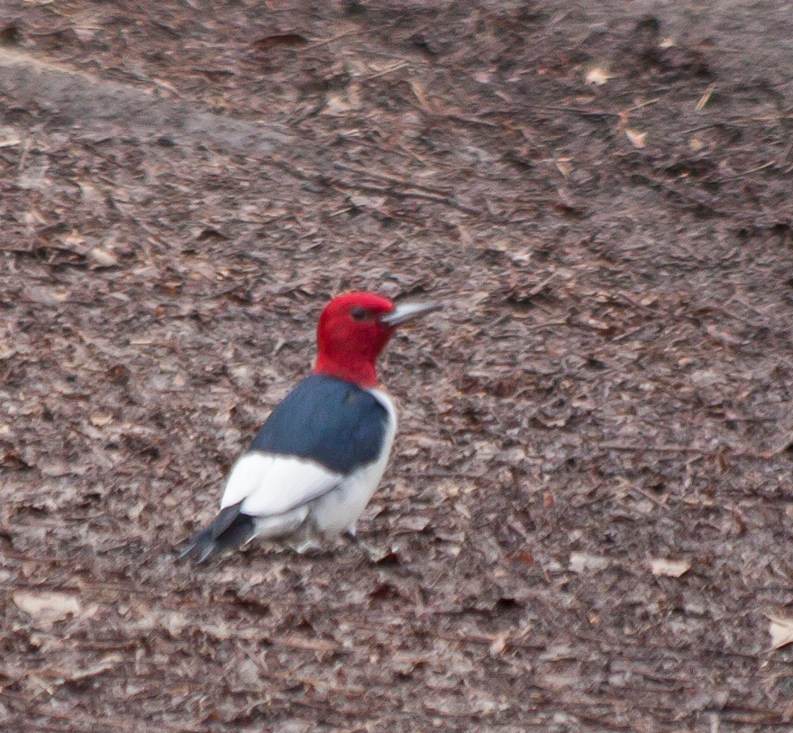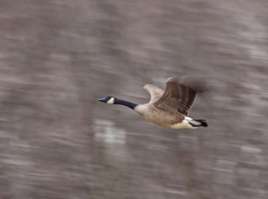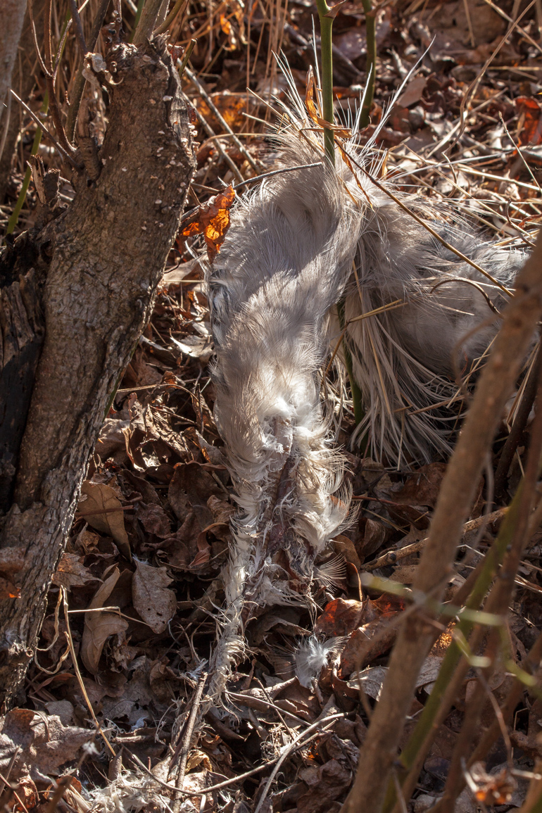 As I was creeping forward to get a clearer shot, I was startled when a large bird flew right across my field of view—I knew almost immediately that it was a Bald Eagle (Haliaeetus leucocephalus), although it too was mostly a shadowy silhouette as I viewed it through the branches of the trees. I was able to react quickly enough to get off a few shots before the eagle flew out of sight.