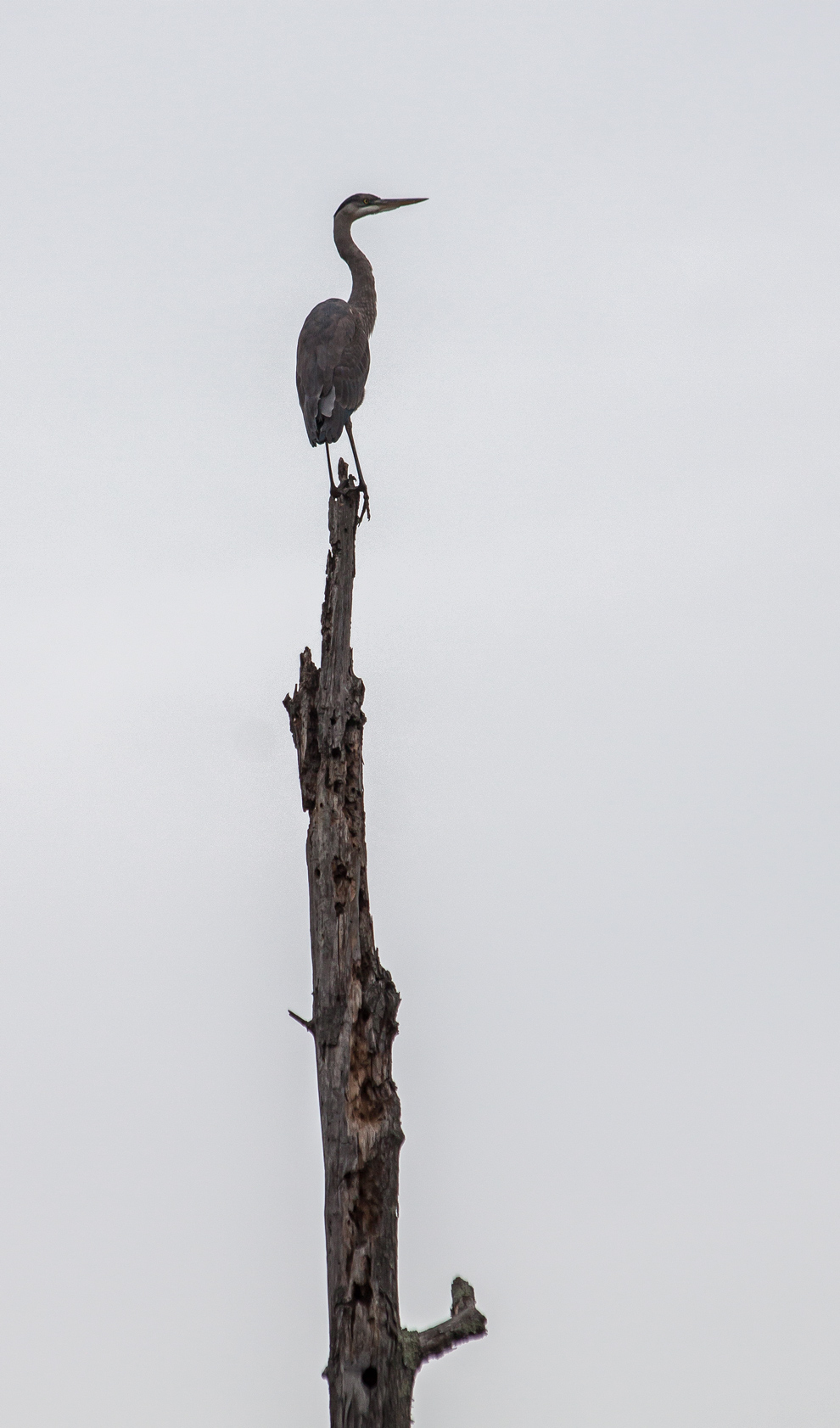I hadn’t seen a live Great Blue Heron (Ardea herodias) at my local marsh in quite some time, so I was excited when I caught sight of the heron, perched on broken-off tree at the edge of one of the marshy fields. The heron was almost a silhouette against the sky, but its shape is very easy to recognize when you see it in profile.