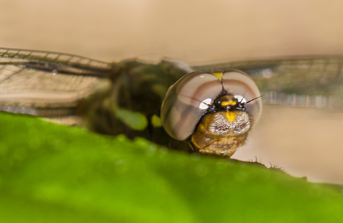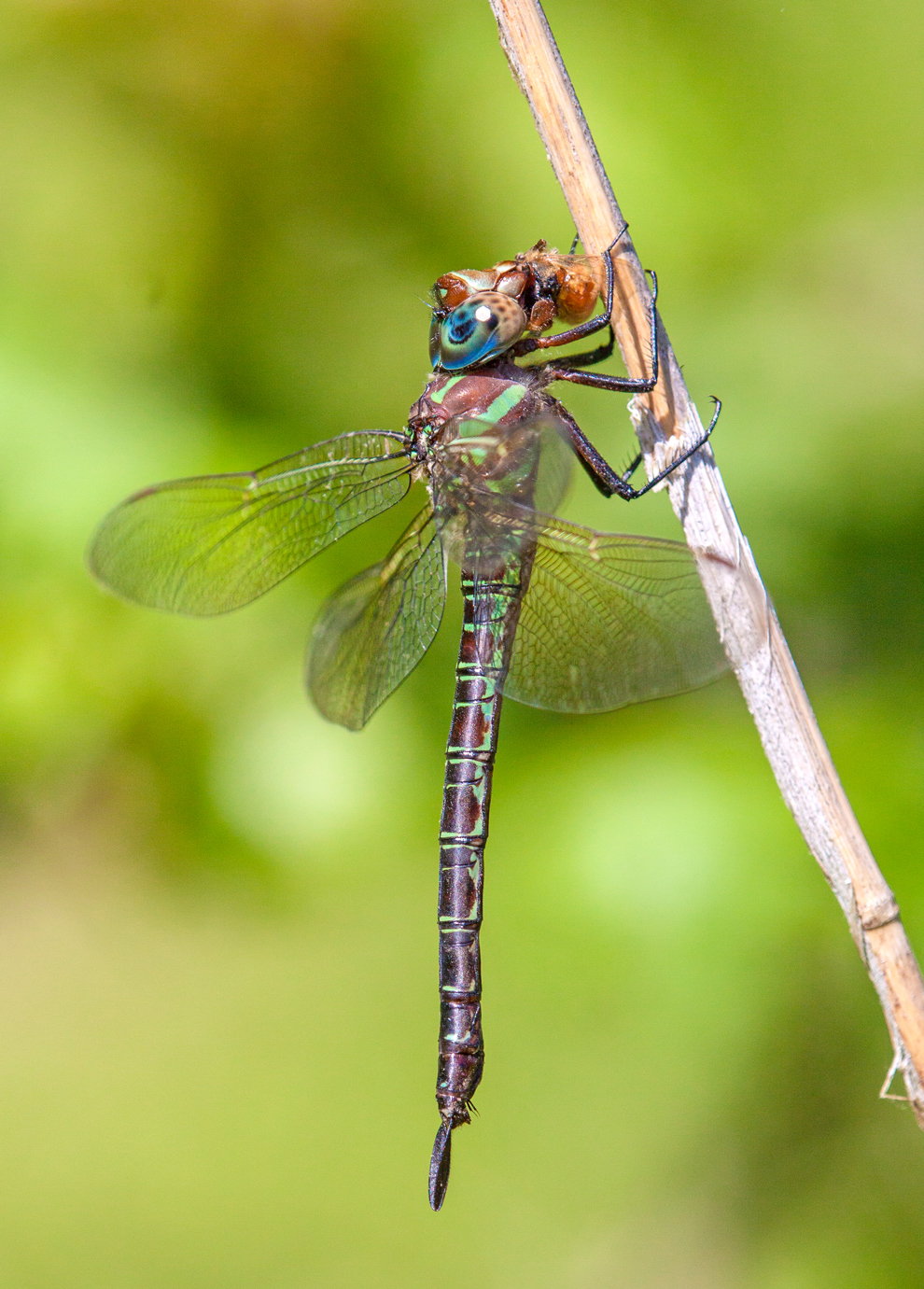 I really like the long sinuous curve on the left and the large expanse of green on the right. I worry, however, that the damselfly is taking up too little space of the image and is not prominent enough. So I cropped a bit and produced a second version.