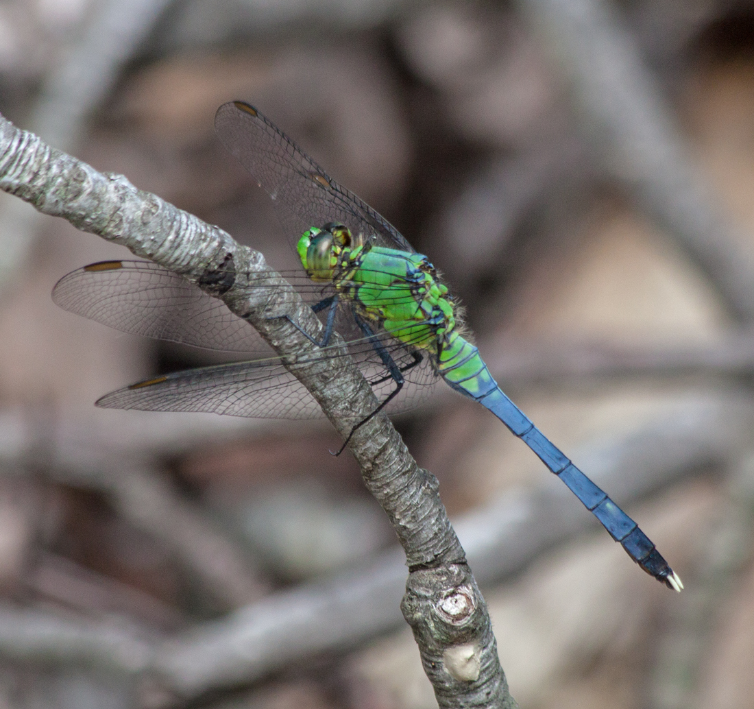 I came across this dragonfly, which I recognized as some kind of clubtail, when I was hiking through a back area of the park. I was struck by the way the dragonfly was patrolling a small sandy stretch of a creek and kept returning to perches on that little beach. I took quite a few photos of the dragonfly, though I really wasn’t sure of its identity.