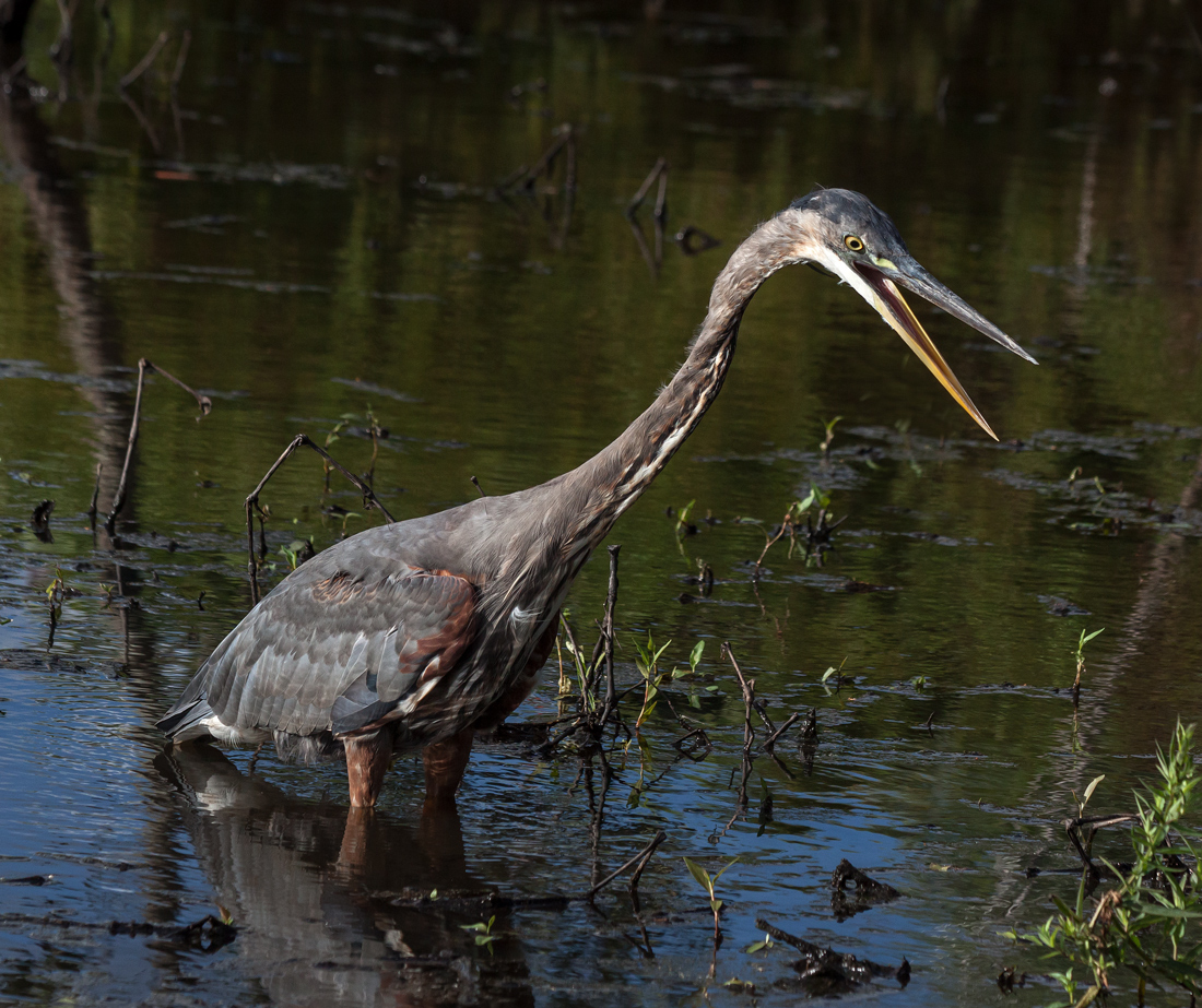 Do Great Blue Herons (Ardea herodias) laugh? I was intently watching this heron recently at my local marsh when he suddenly opened his mouth. It wasn’t really a yawn, and he certainly didn’t seem bored. It was more like something had struck him as funny—it might have been me.