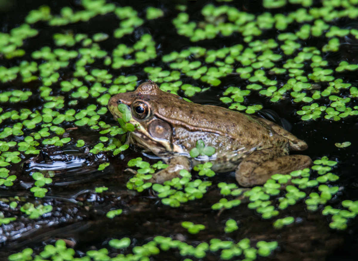 Identification aside, I really like the way that this frog is surrounded by and partially covered with duckweed as he tries to stay cool on a hot day in July.