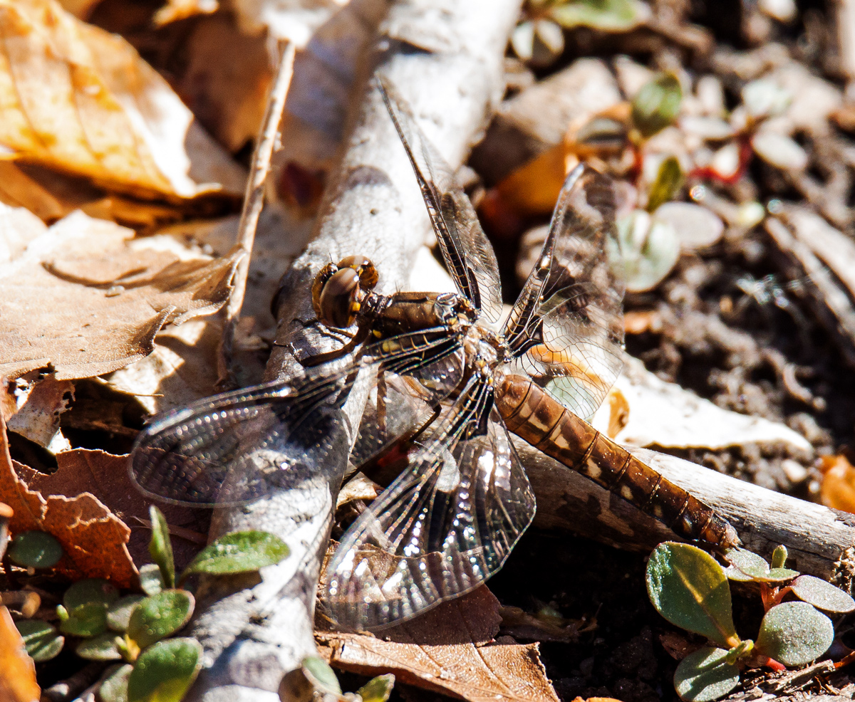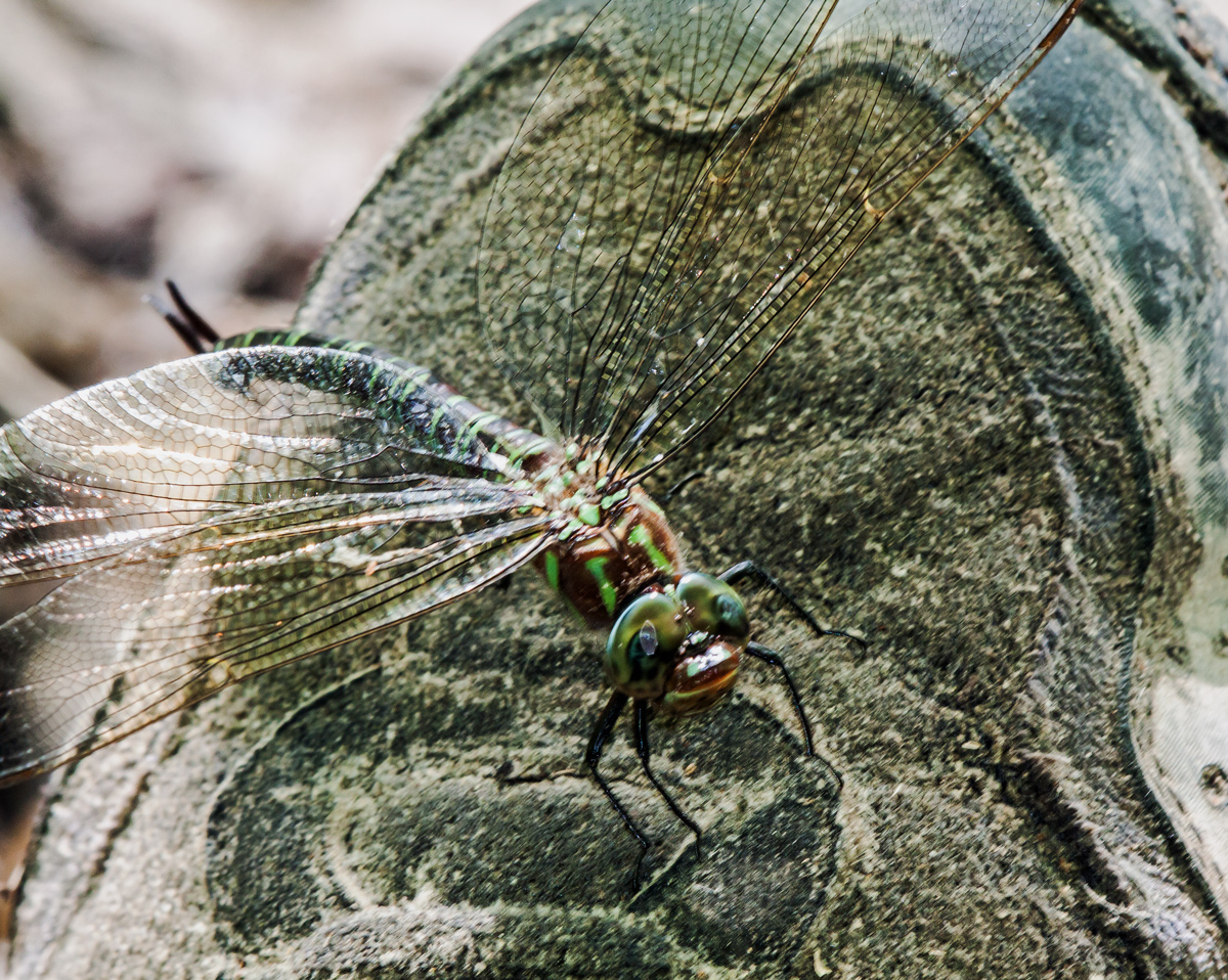 About this time each year, a number of female Swamp Darners descend on this small ditch to lay their eggs. Unlike many other dragonflies, which lay their eggs in the water, Swamp Darners lay their eggs in moist, often rotten logs. Essentially they tunnel into the wood before they lay the eggs.