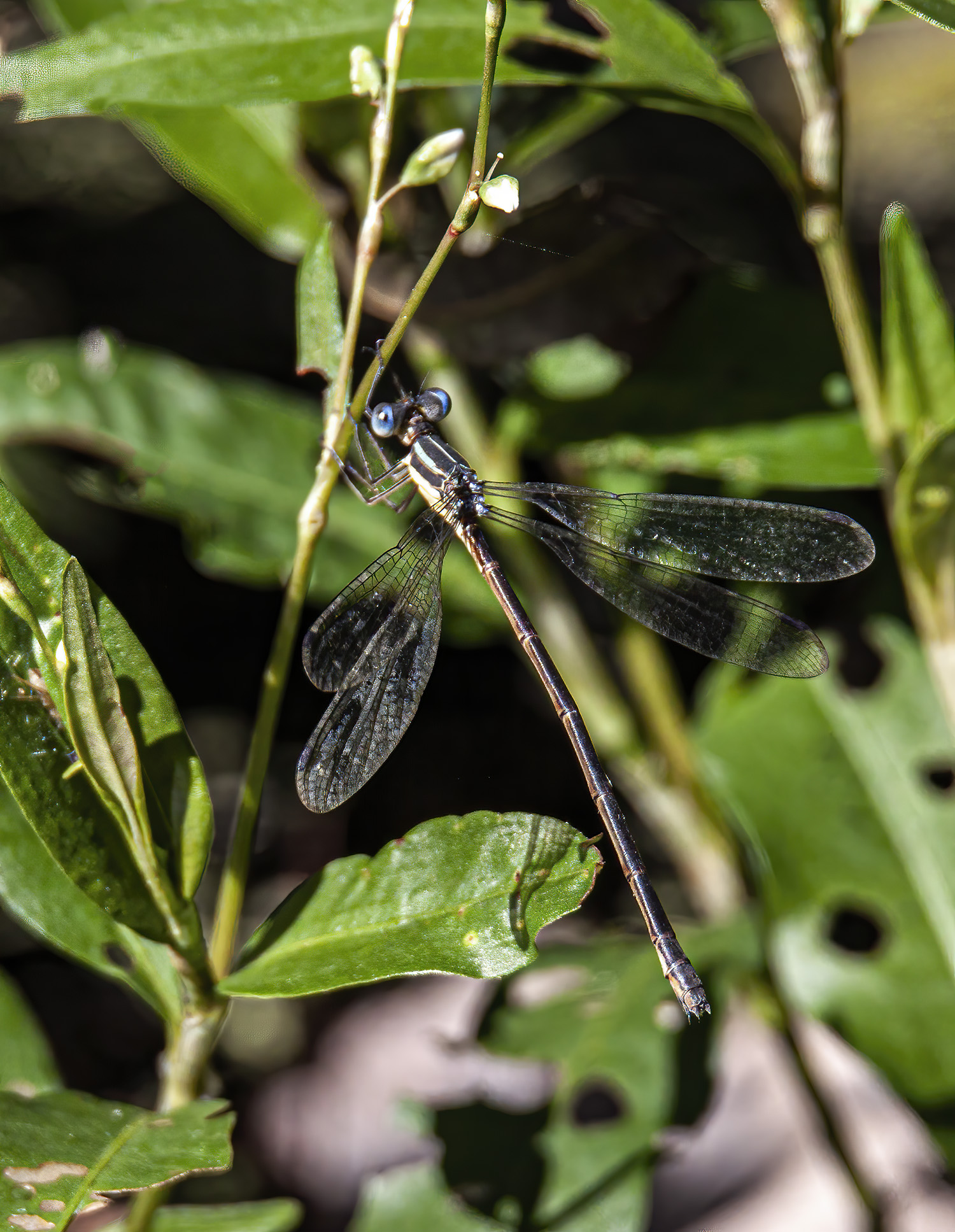 Fortunately, though, there are other areas in the park to explore, including a boardwalk that runs through a wetland areal, and we did manage to get some shots of other subjects. The day was starting to come to a close and we started down a gravel-covered trail heading for the parking lot. As I was scanning the vegetation on the side of the trail I suddenly caught sight of a spreadwing damselfly perching in a patch of greenbrier vines.