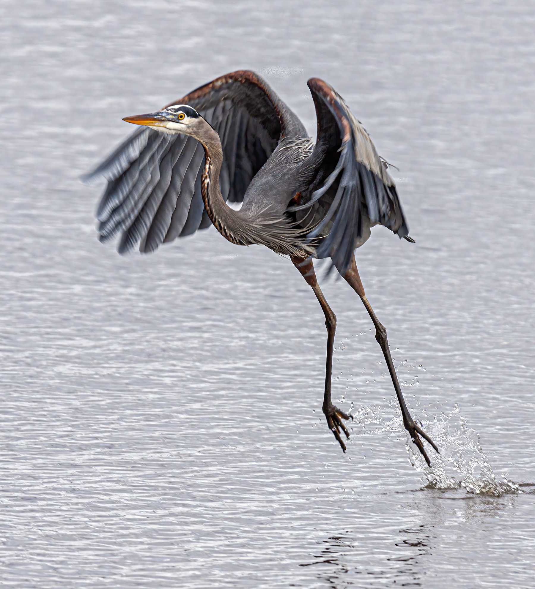I captured the middle shot just after the heron had taken off and you can see water drops coming off of the heron’s feet if you zoom in on the image. I was most shocked that I managed to capture the image of the heron with outstretched wings—the heron got really wide really quickly and I was almost zoomed in too closely. I actually cut it even closer than it appears and I added a bit of additional water to the left and upper image edges of the shot to create the image that you see.
