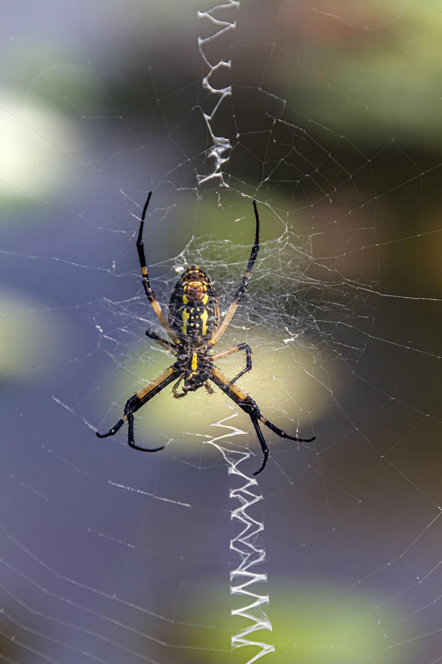 One of the coolest things about this spider is the distinctive zig-zag pattern, known technically as a stabilimentum that the spider uses for the central part of its web. According to Wikipedia, the purpose of the zig-zags is disputed. “It is possible that it acts as camouflage for the spider lurking in the web’s center, but it may also attract insect prey, or even warn birds of the presence of the otherwise difficult-to-see web.”