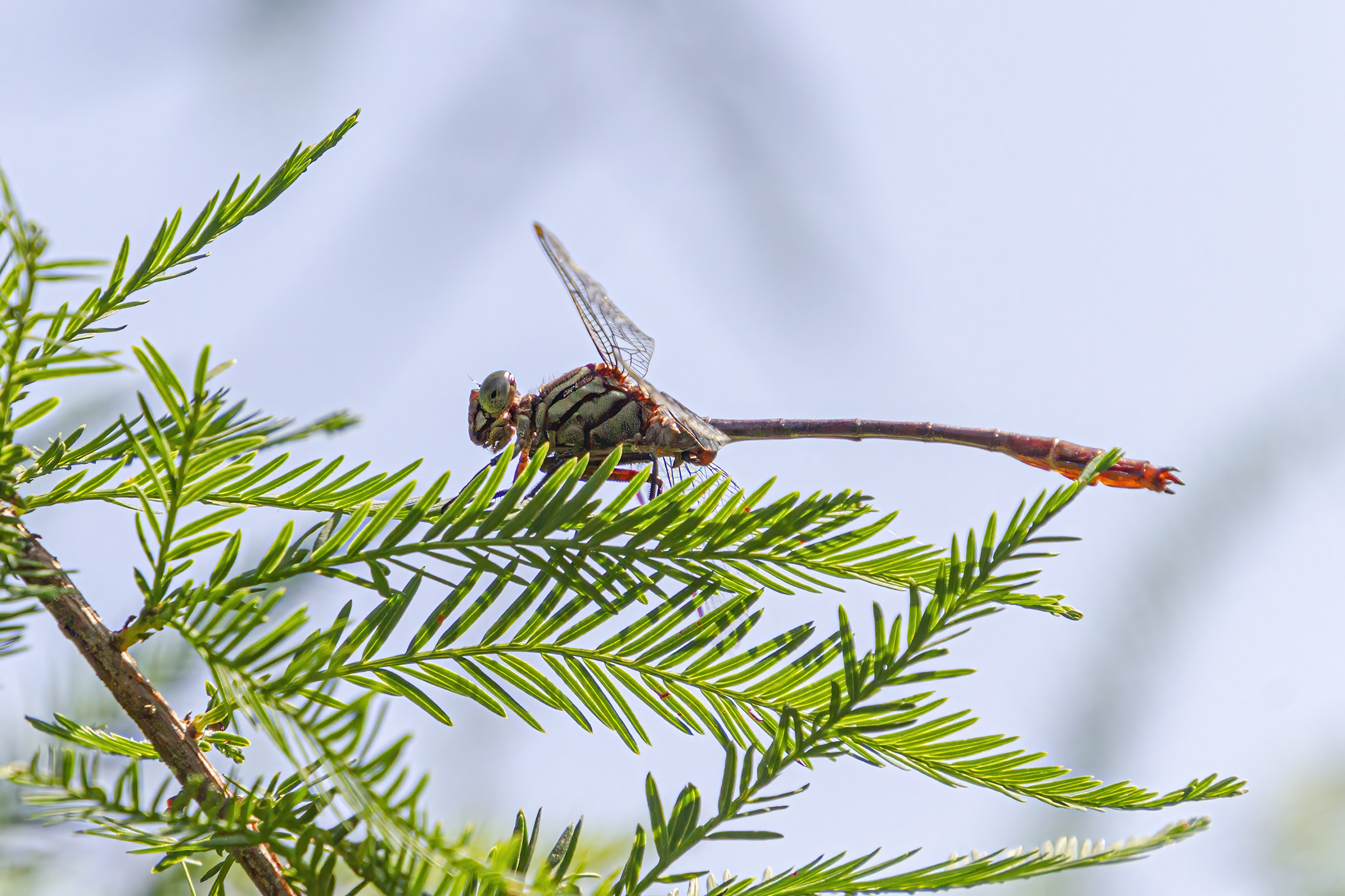 Here are some shots of Russet-tipped Clubtail dragonflies (Stylurus plagiatus) that I photographed at Jackson Miles Abbot Wetland Refuge last Saturday. The first image shows a male perched in an evergreen tree. Sharp-eyed views may recognize this tree, which is the same one on which yesterday’s Common Green Darner was perched.