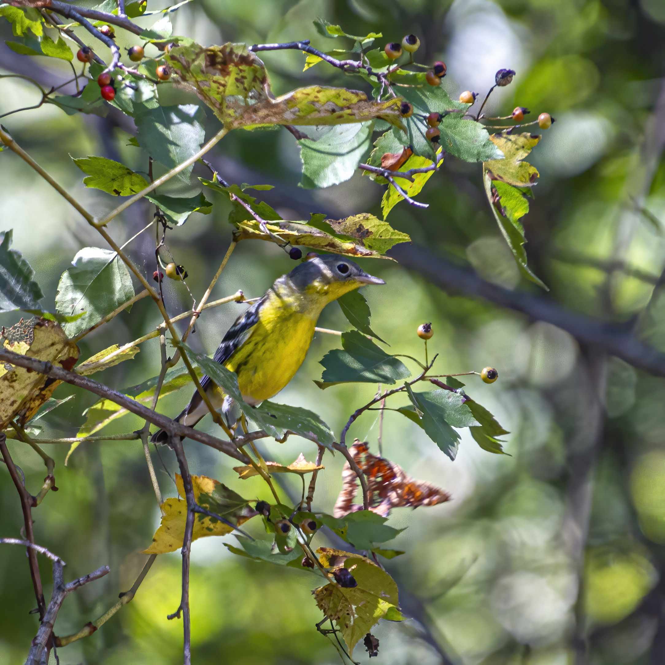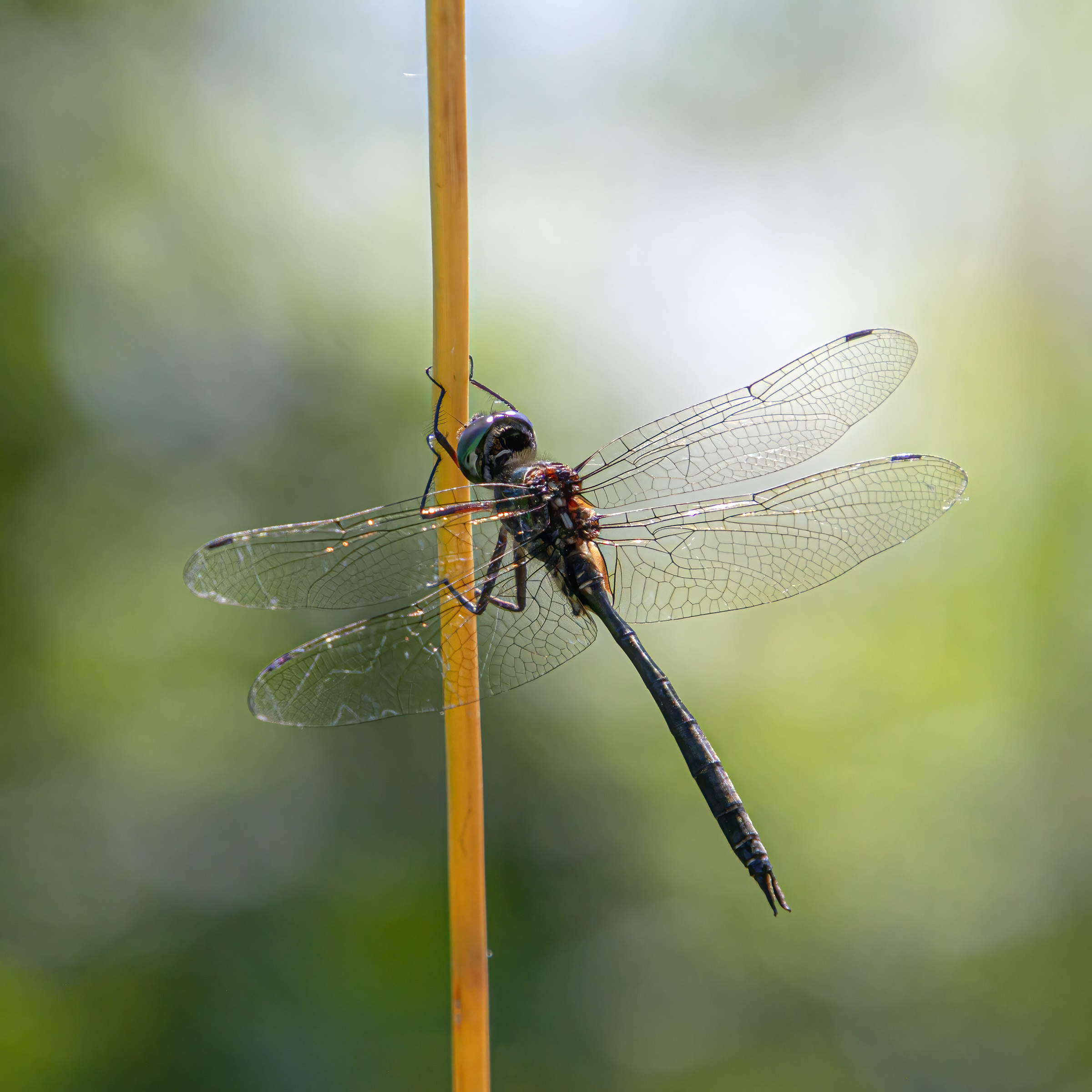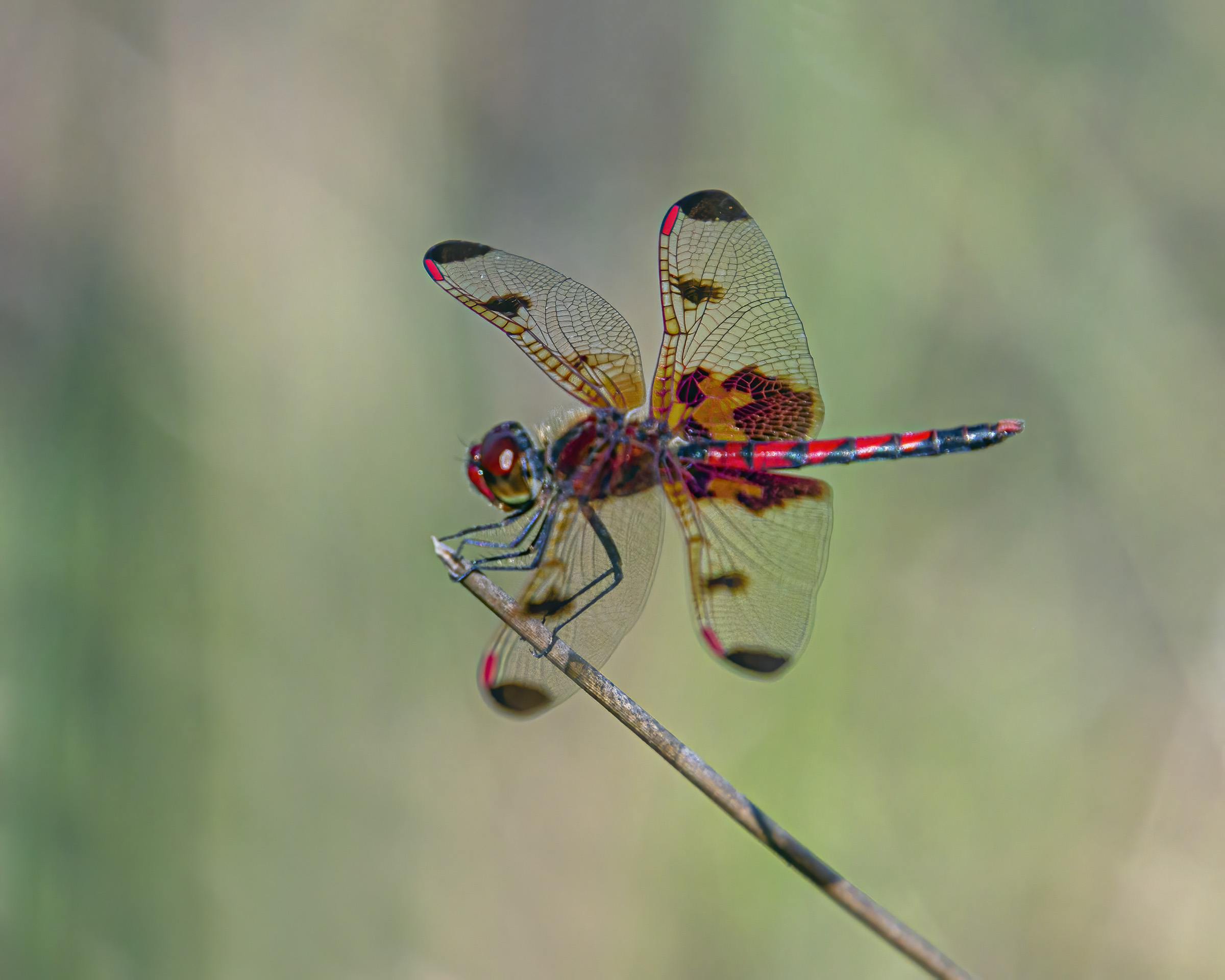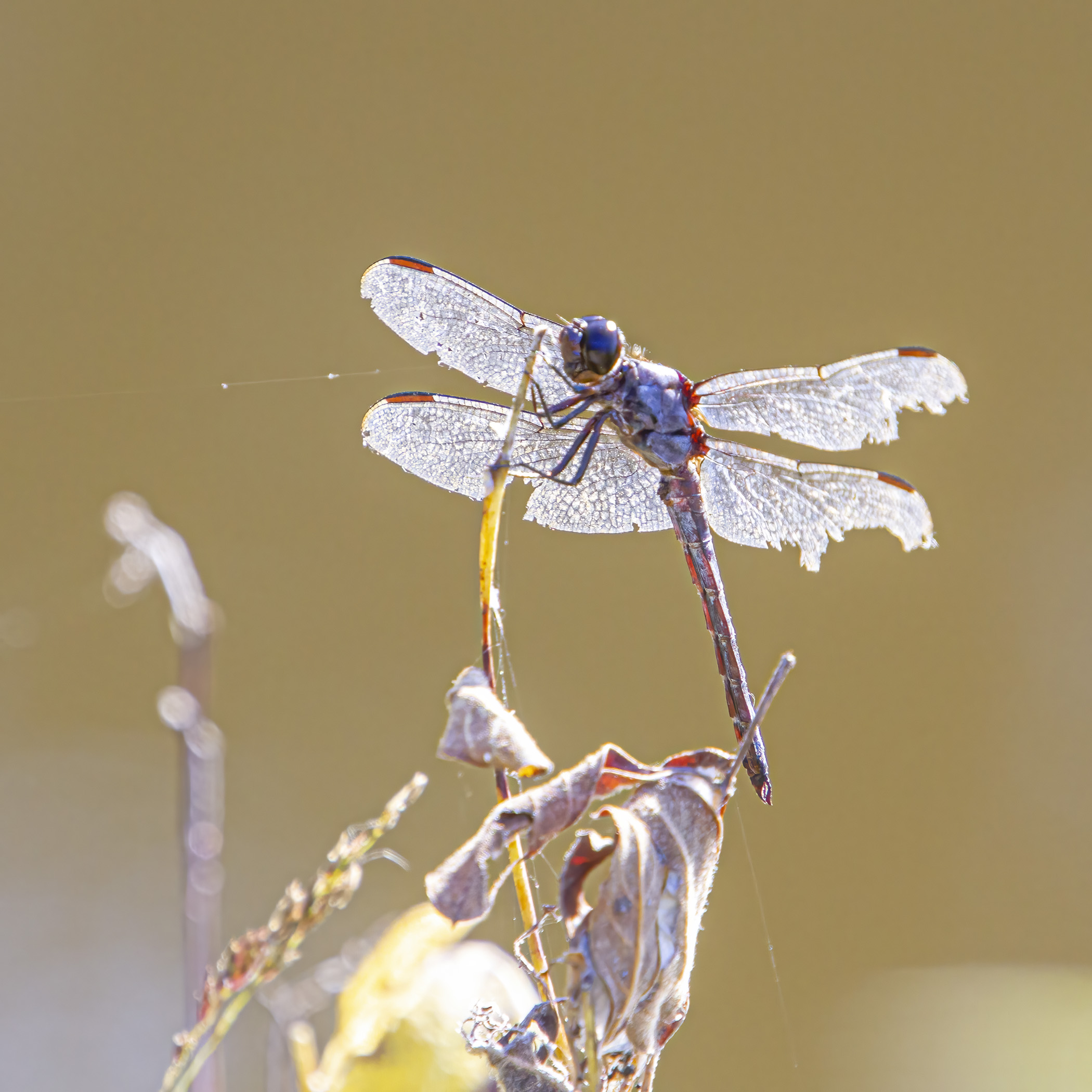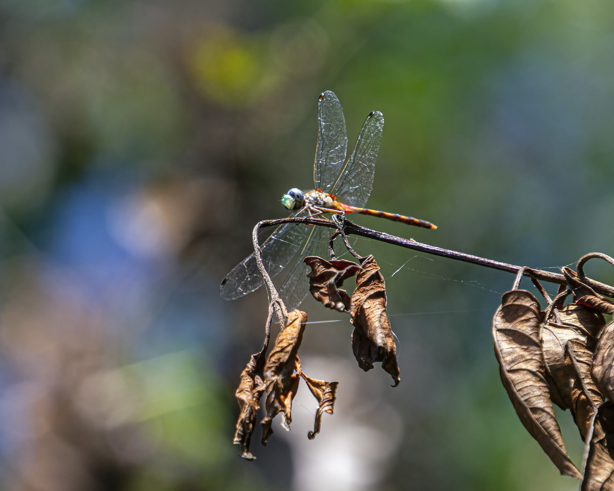 It is a fun challenge to point your camera toward the sky and to try and capture photos of these colorful dragonflies as they zoom overhead. The first image is the sharpest image that I was able to capture and it provides a good look at the dragonfly. In many ways, though, I am even happier with the second and third image that include some vegetation and help to provide some context to the shots.