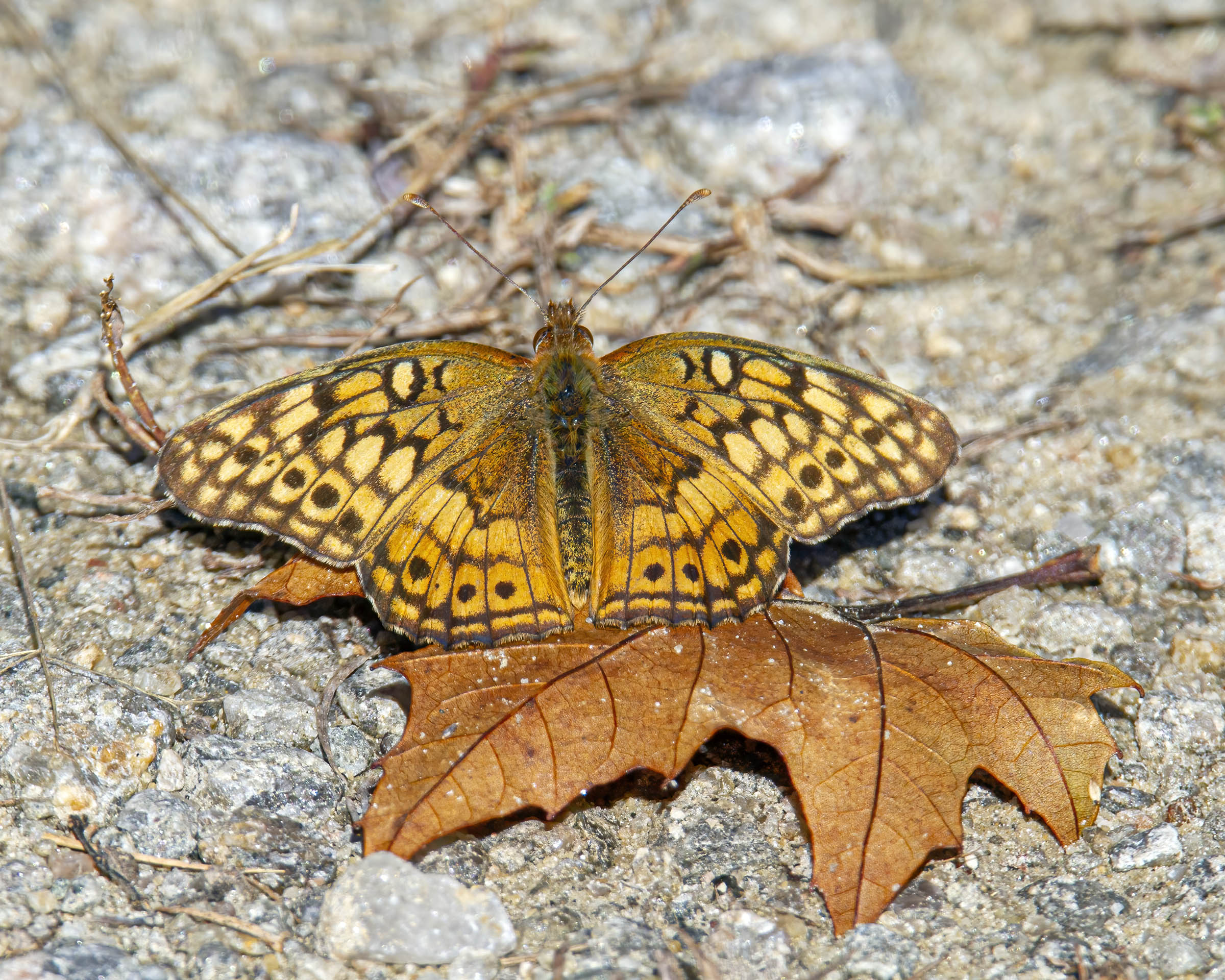 I chased this orange butterfly for quite some time on Wednesday at Occoquan Bay National Wildlife Refuge and was delighted when it chose to land on top of a fallen leaf. The warm oranges and browns of the butterfly are a wonderful match for the autumn season and the fallen down leaves that now litter the landscape.
