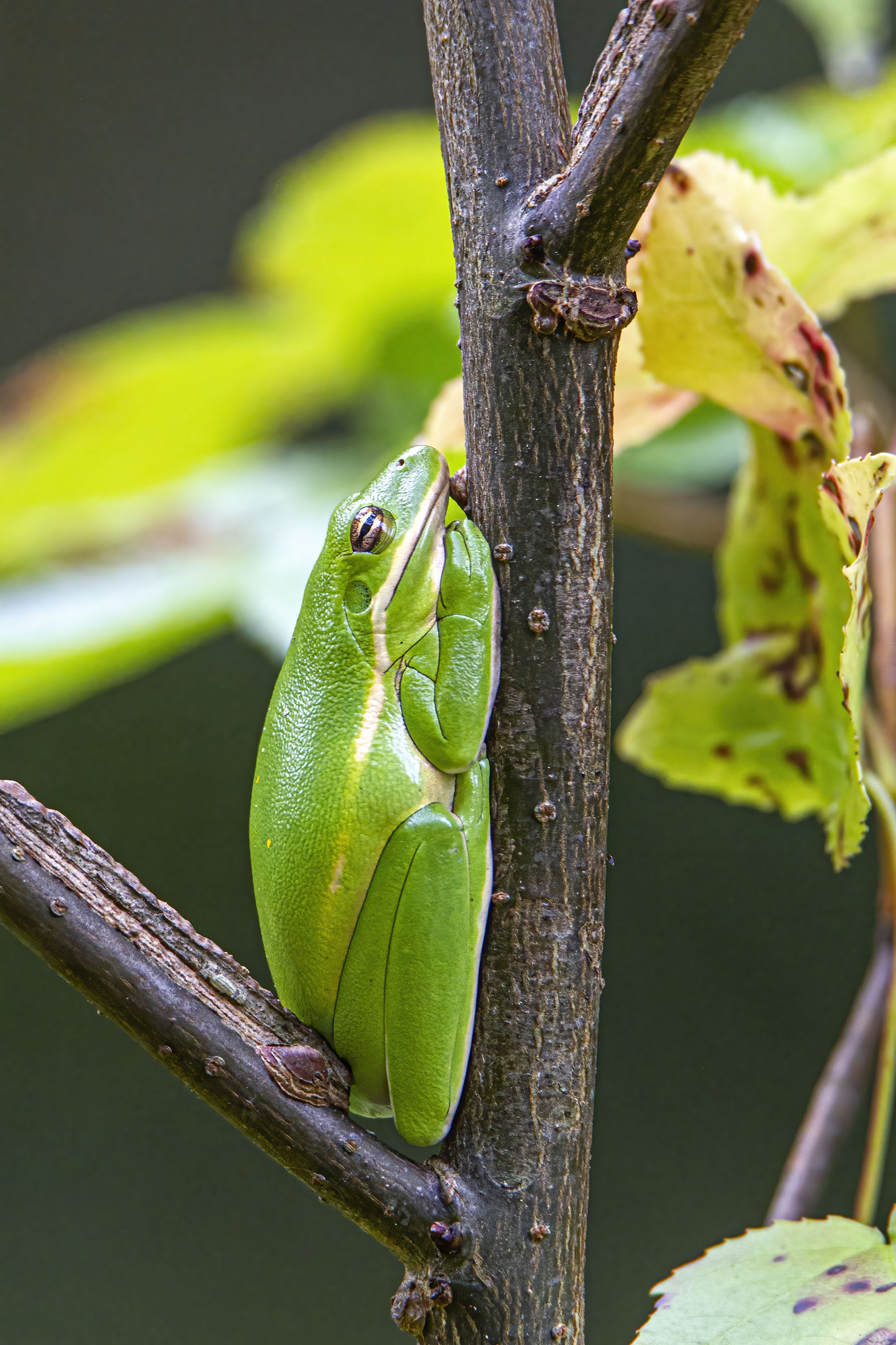 Yesterday afternoon the rain finally stopped and the skies were gradually clearing, so I decided to go out with my camera. I spotted this tree frog when I was walking along one of the trails at Huntley Meadows Park, a nearby marshland park that I have avoided the last few years because it tends to be overcrowded. The frog was perched in the crotch of a small tree just off of the trail.