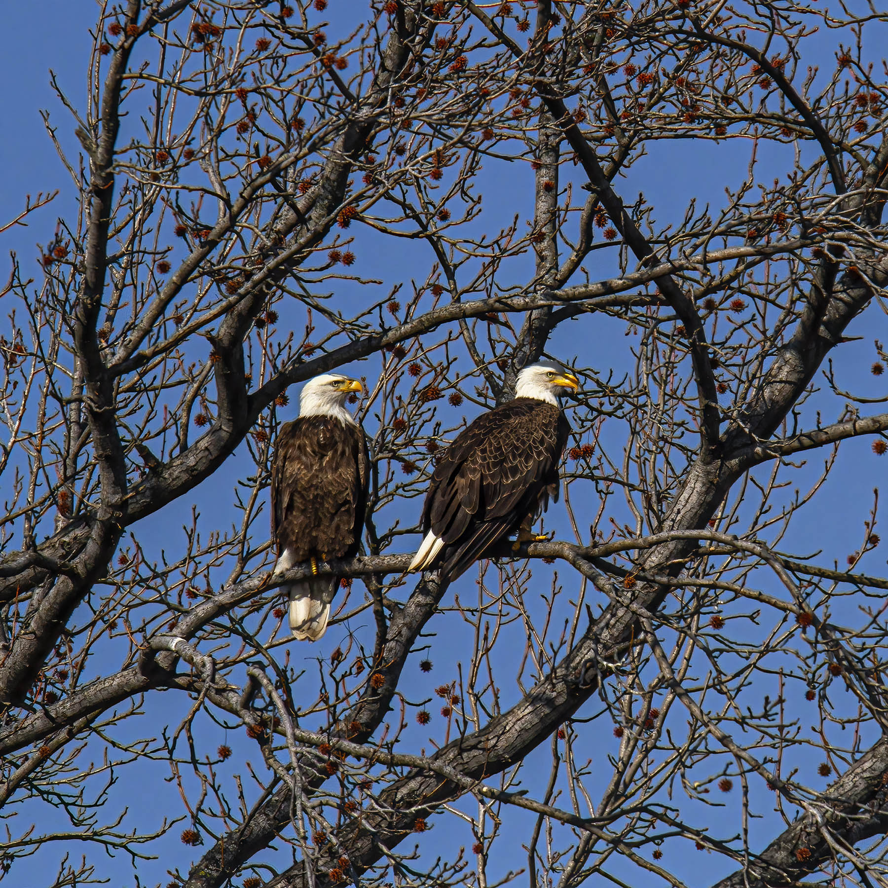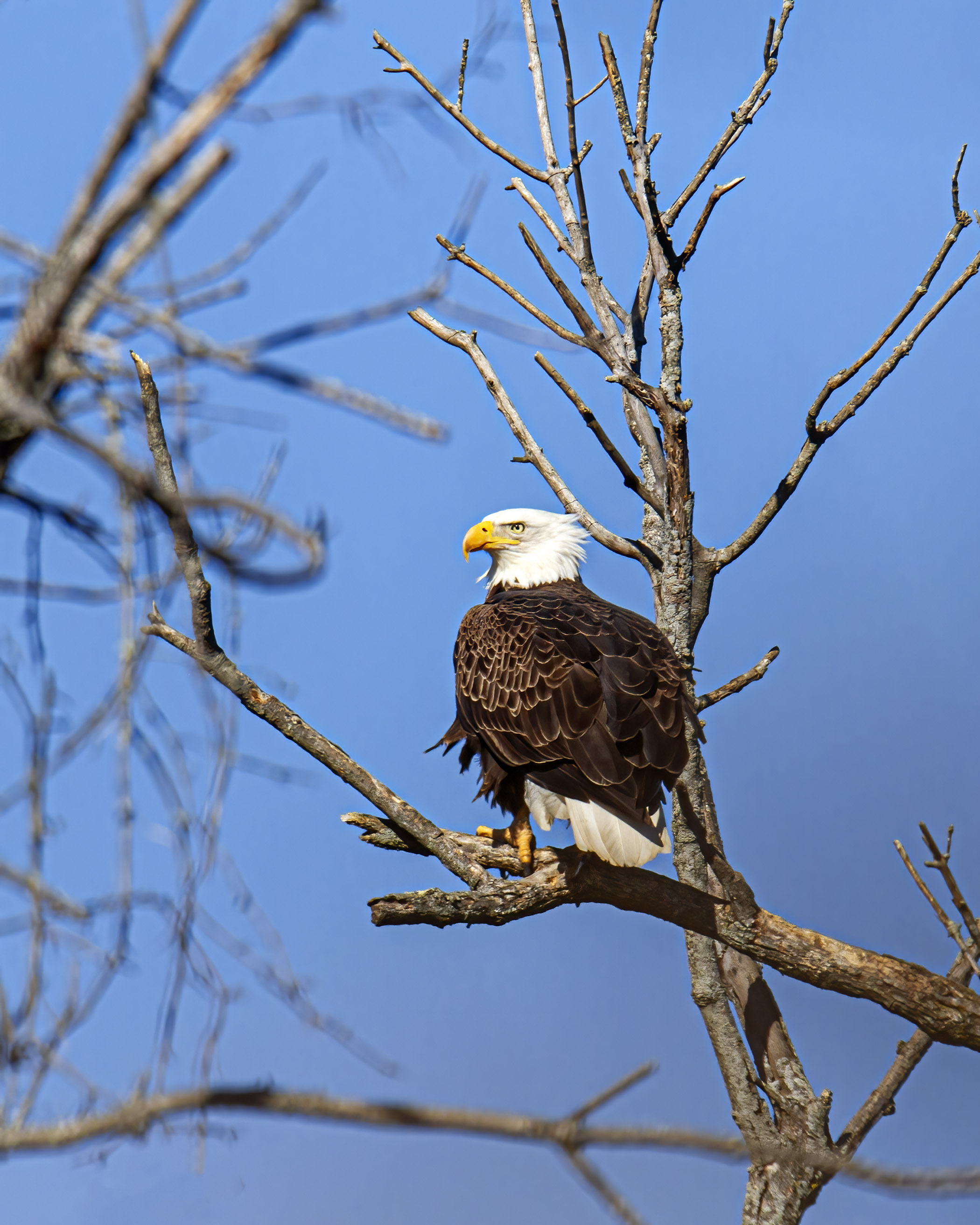 Whenever I am observing a perched Bald Eagle (Haliaeetus leucocephalus), I look for signs that it is preparing to take off. Sometimes there are little clues, like a flex of the wings or a slight movement of the feet, but quite often there is no warning. Usually I have my camera on a monopod, so my arms do not get fatigued as I try to stay ready and focused.