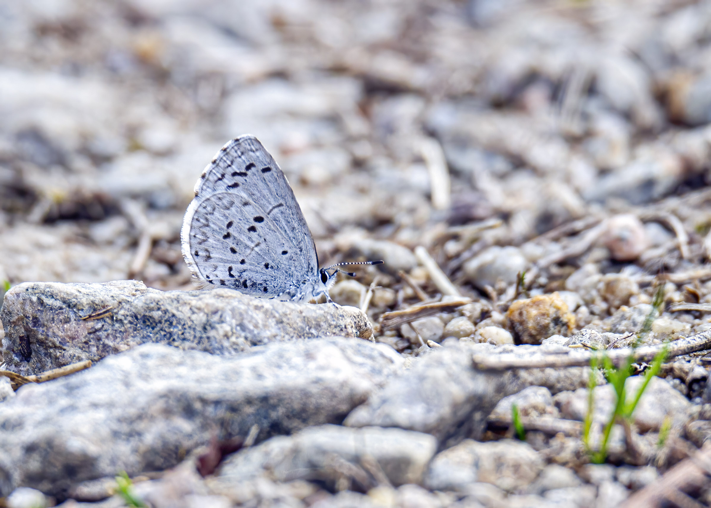 Later in the afternoon, I spotted a Spring Azure (Celastrina ladon) butterfly that was perched amidst the rocks on a gravely section of one of the trails. Spring Azure butterflies are very small—about one inch (25 mm) in size—and it was quite a challenge to get a shot of this one using the 150-600mm lens that was on my camera at that moment.