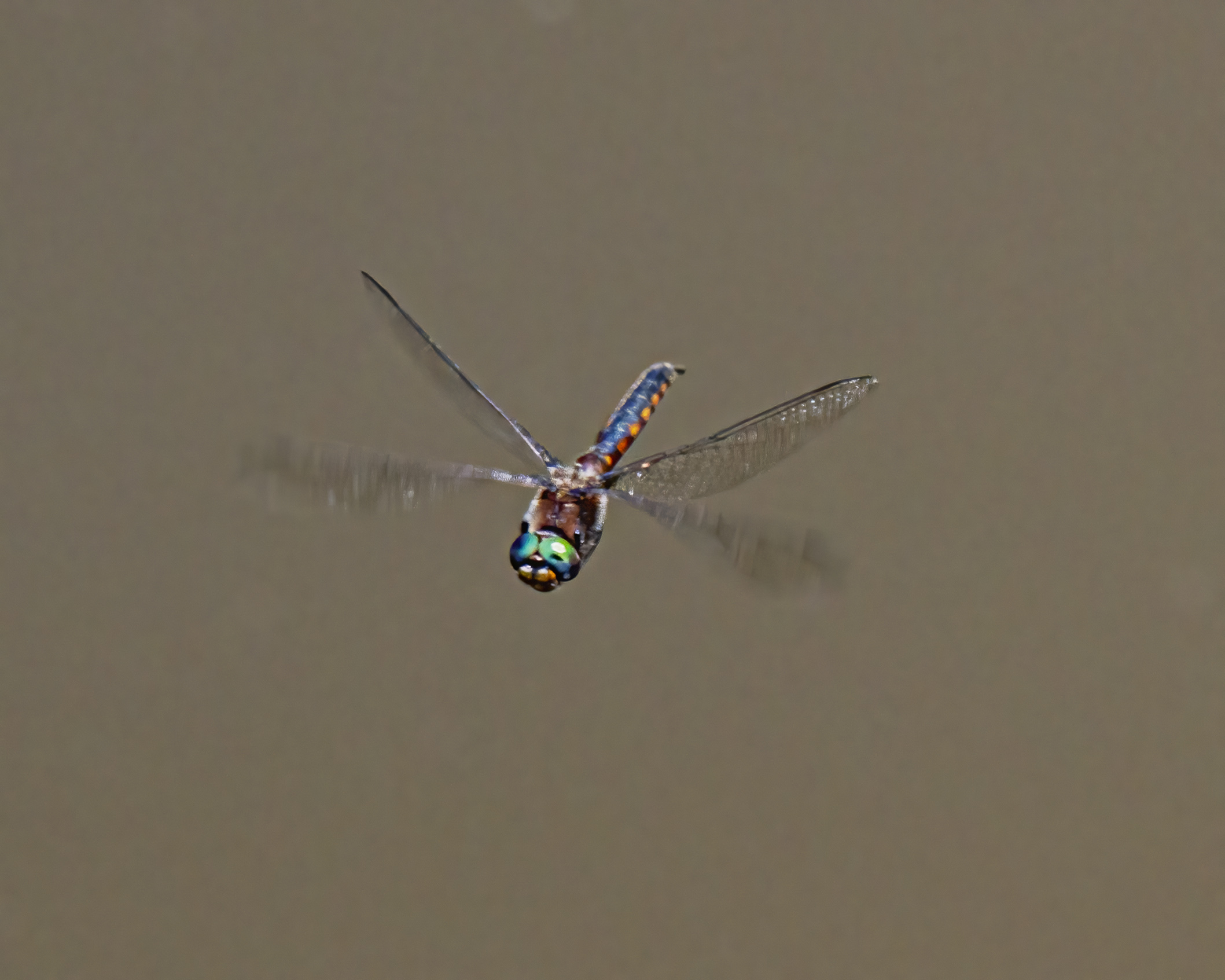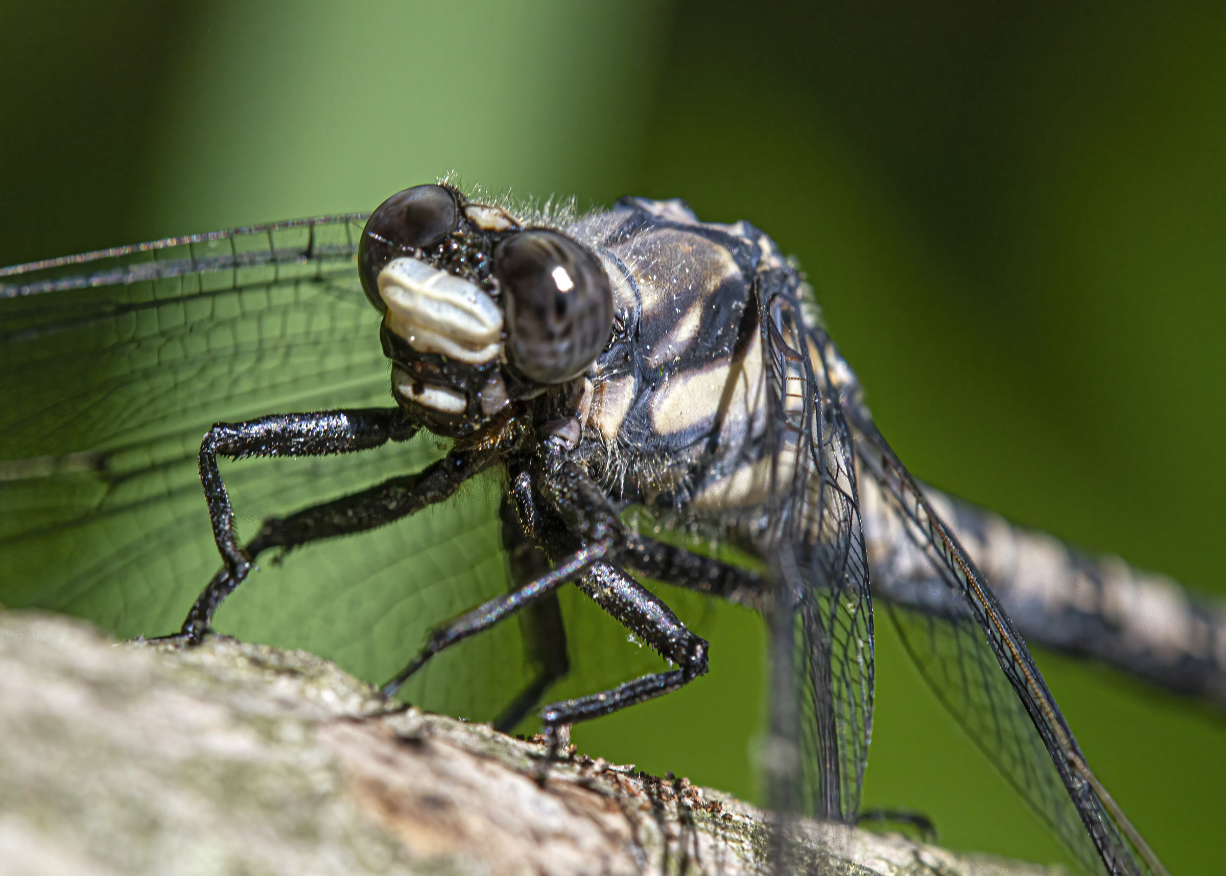 I was thrilled by the amount of detail that I was able to capture. You can easily see the distinctive “bullseye” marking, for example, on the “face” of the dragonfly. The second image is a closer crop of the first image and it helps you to see some of the ommatidia, the thousands of faceted optical units that make up the dragonfly’s amazing compound eyes. You may want to click on the image to make it larger on your screen.