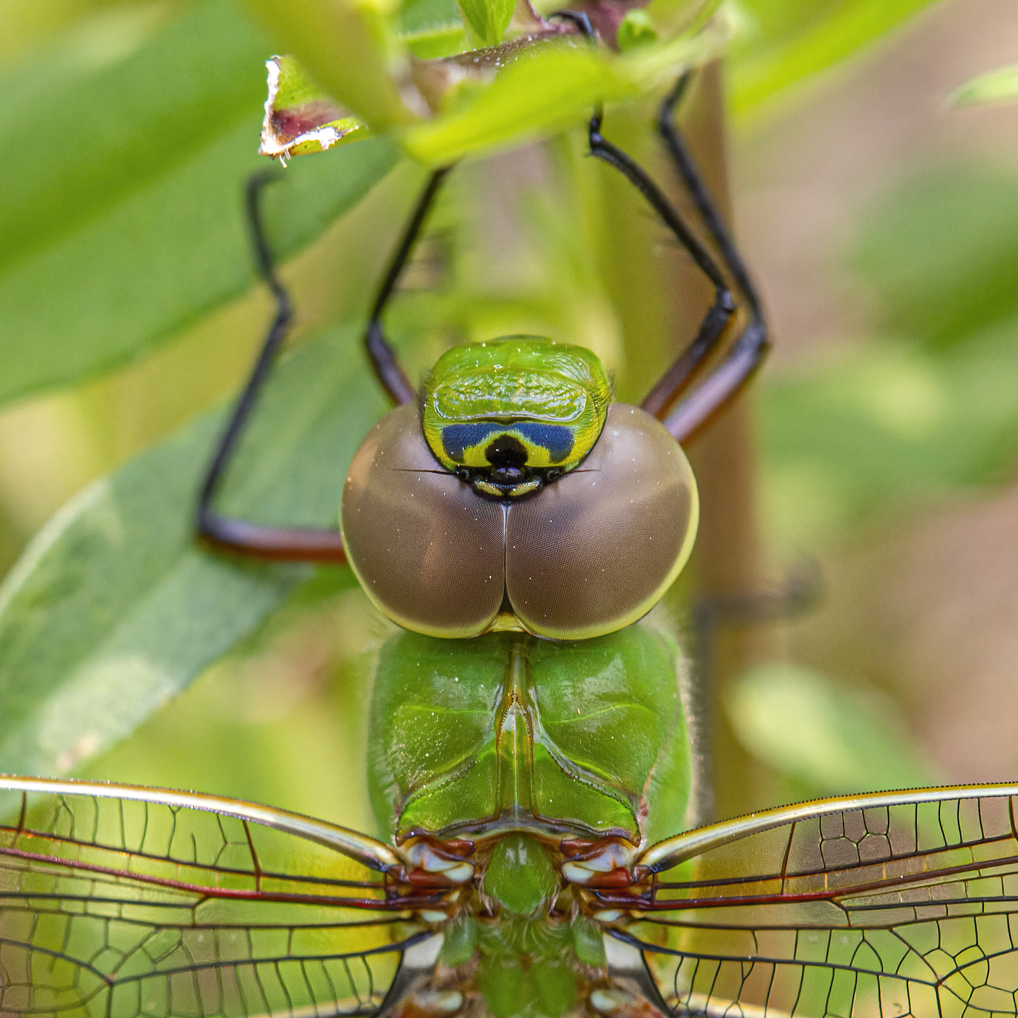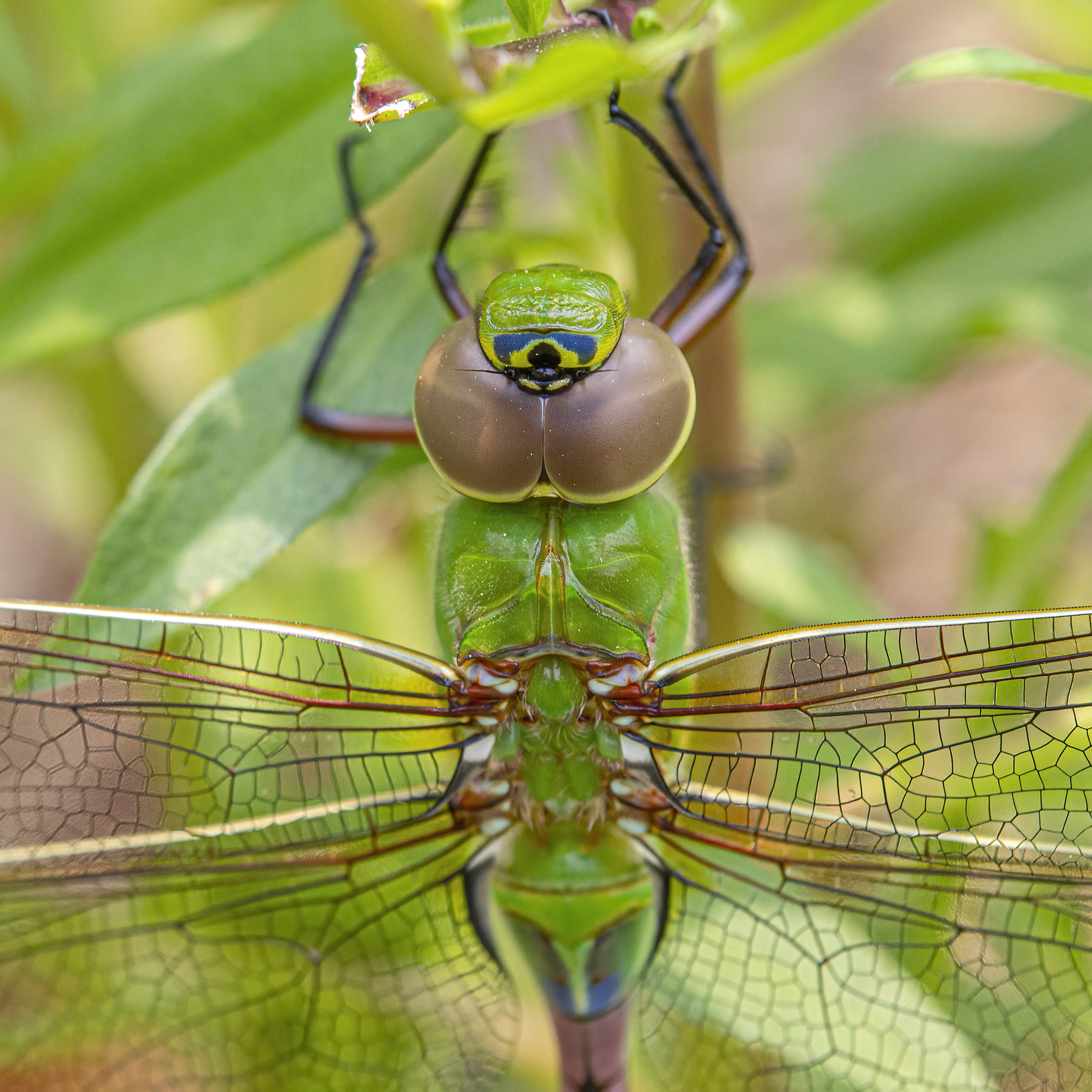 I spotted this dragonfly when I saw it fly to a perch in the vegetation just inches above the ground. I slowly made my way towards the vertically-perched Common Green Darner and surprisingly it did not move. I am not certain, but I had the impression that the dragonfly had newly emerged and was resting as its body parts dried out.
