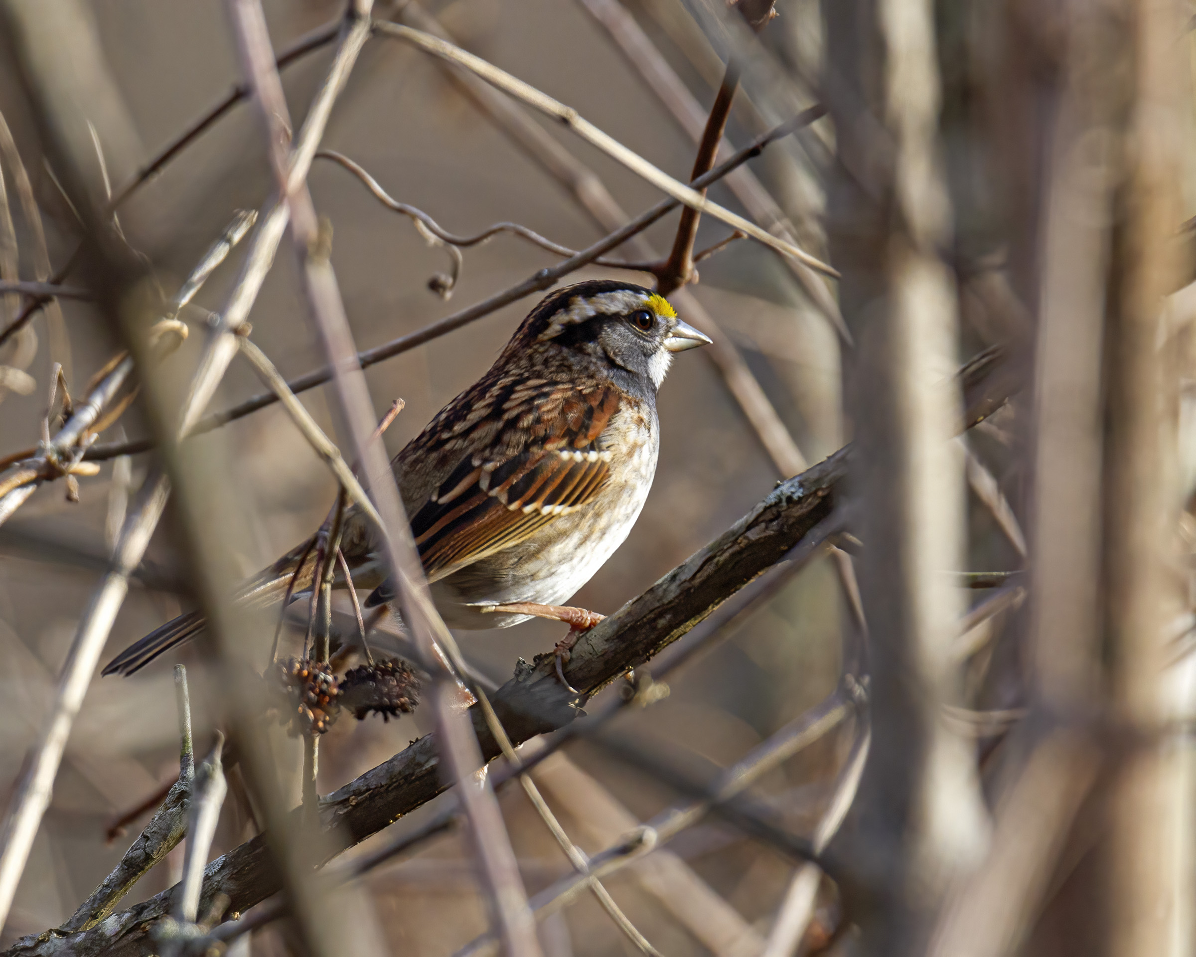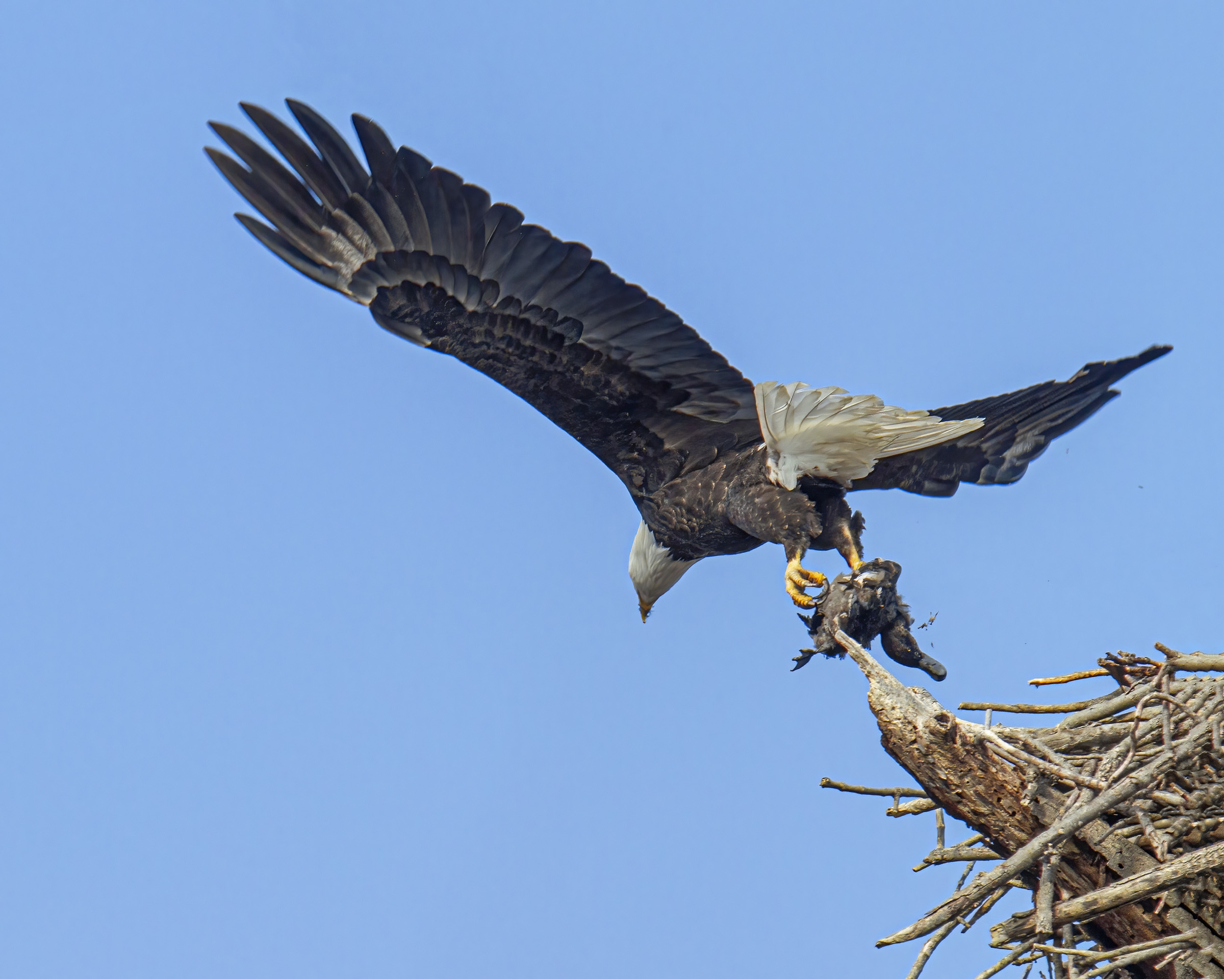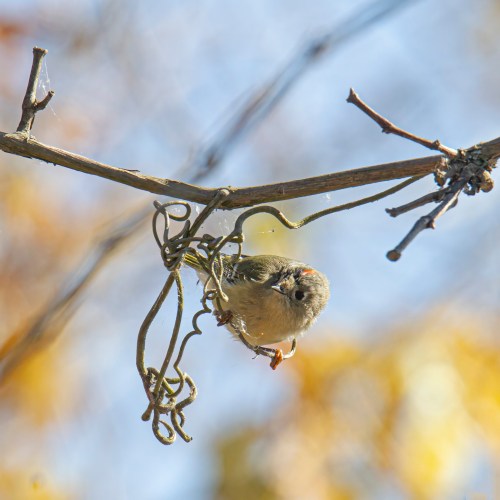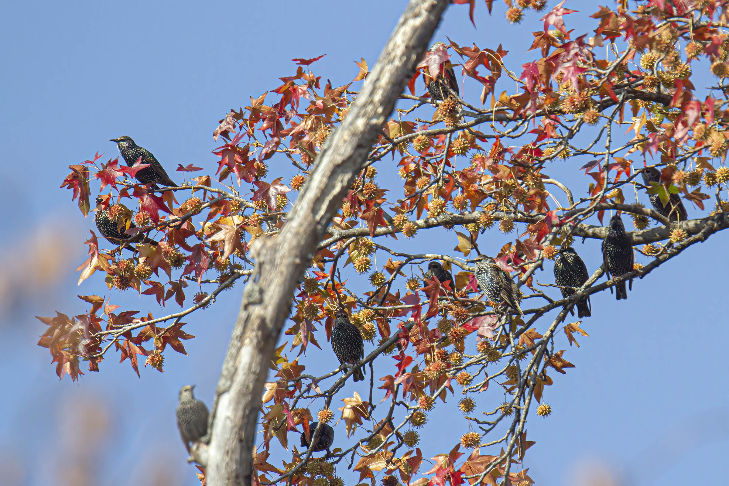 The second photo shows an Olympic-level acrobatic move in which the bluebird launched itself into the air from a branch and swiveled its head a full 180 degrees. Wow! When I first looked at the photo, it took me a moment to realize that the bluebird’s body was facing me, but its head was facing in the opposite direction. I was fortunate to capture the moment when the bluebird had extended its wings fully to arrest its forward movement and give it an extra split second to grab a berry. The colorful foliage in the background was a nice bonus.