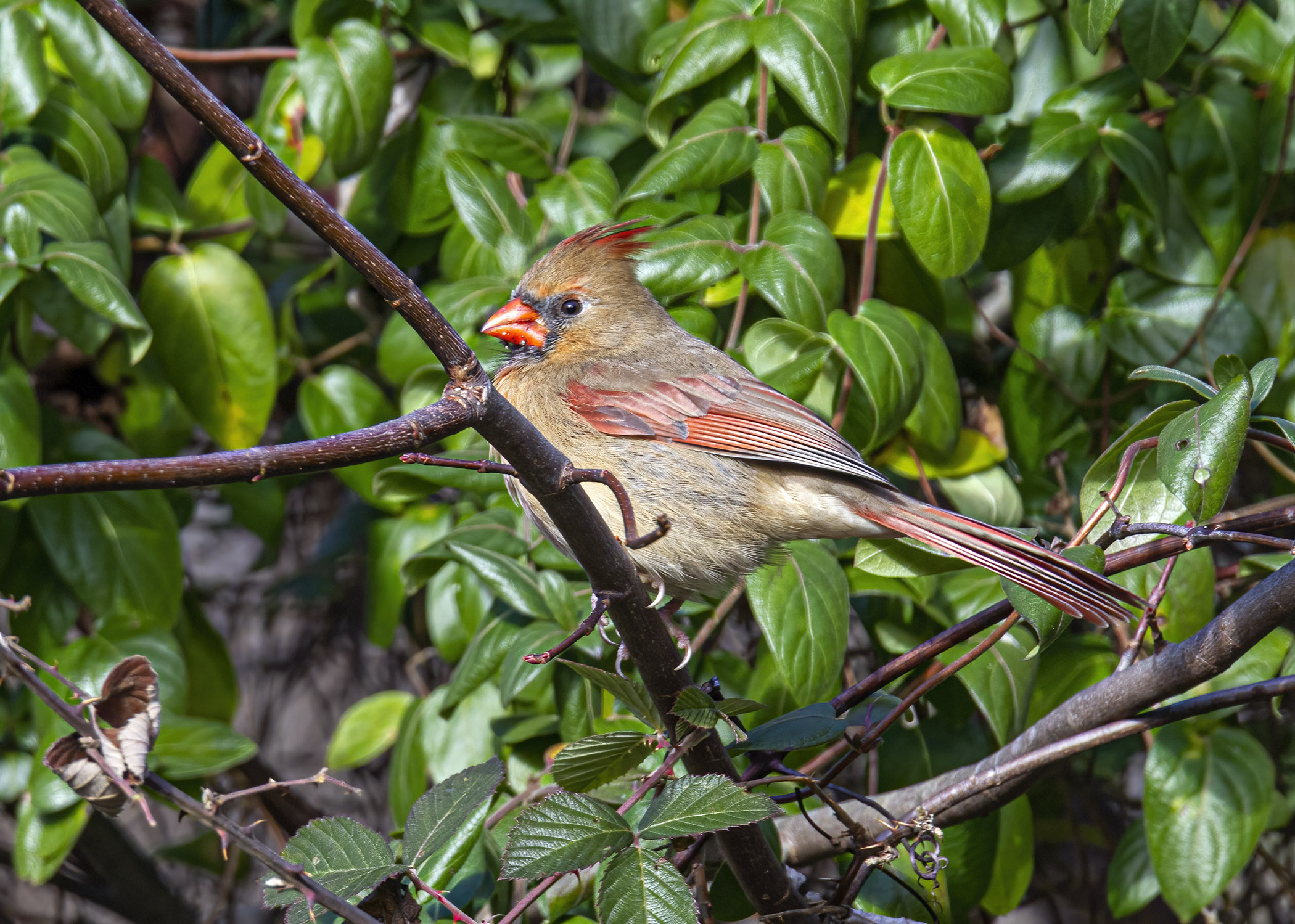 I do love bright colors—I drive an Ignition Orange KIA Soul—but I think there is something more refined and sophisticated when those colors are used in moderation as accents. That is why I really like the way a female cardinal has reddish streaks in her crown and on the outer portions of her wings.