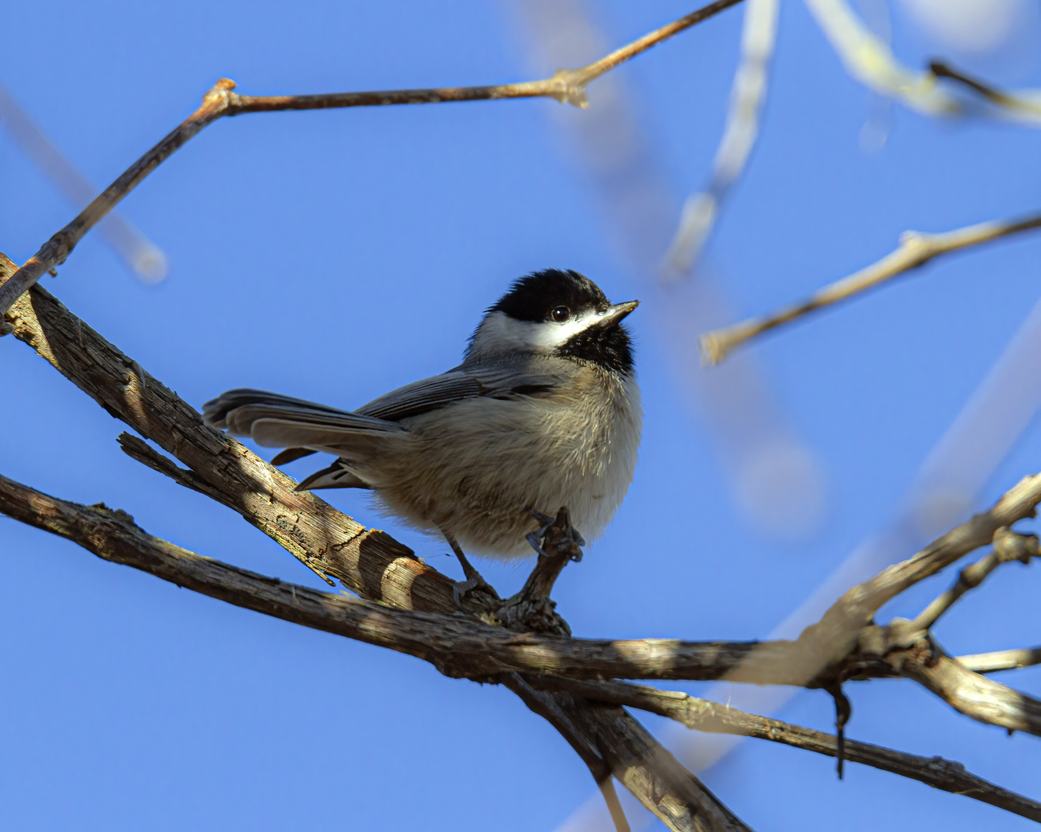 Even when they are perched, these chickadees are a bundle of energy and seem to be constantly changing head and body positions. As you can see from these two shots, the chickadee was surrounded by branches, so I had to bend and stretch a lot to get a clear shot. Lighting was also an issue, because the little bird often had its head pointed down and was covered with shadows.