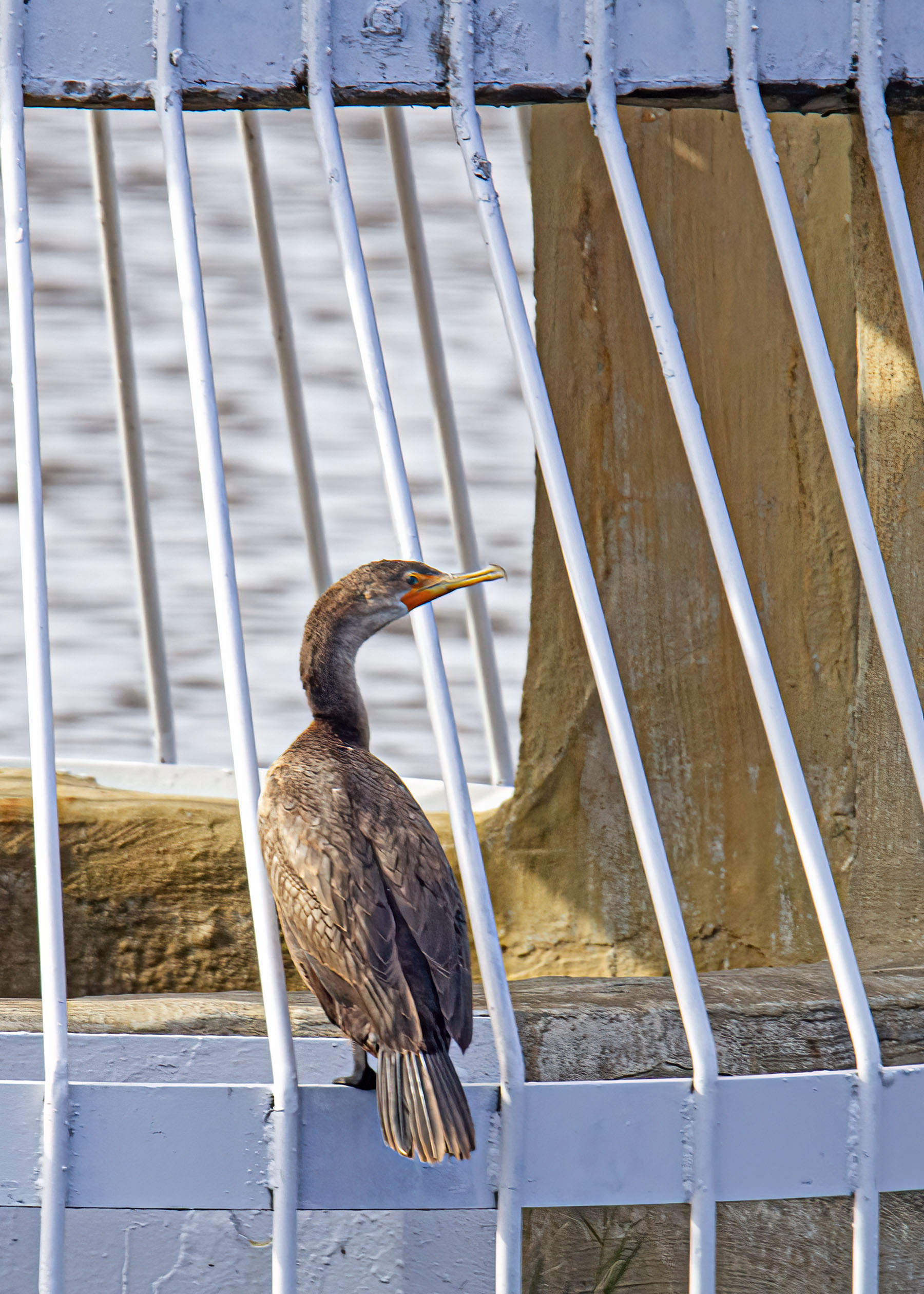 When I circled around the pond a second time the cormorant (or possibly a second cormorant) was hanging out on a man-made structure sticking out of the water in the pond that is probably part of the water filtration system. Often when I see cormorants out of the water, they have their wings spread wide to dry them out, but this cormorant had its wings closed and just seemed to be chilling out. Generally I avoid including man-made objects in my wildlife photos, but I like the juxtaposition of the curves and warm color of the cormorant with the straight lines and cooler cooler colors of the structure.
