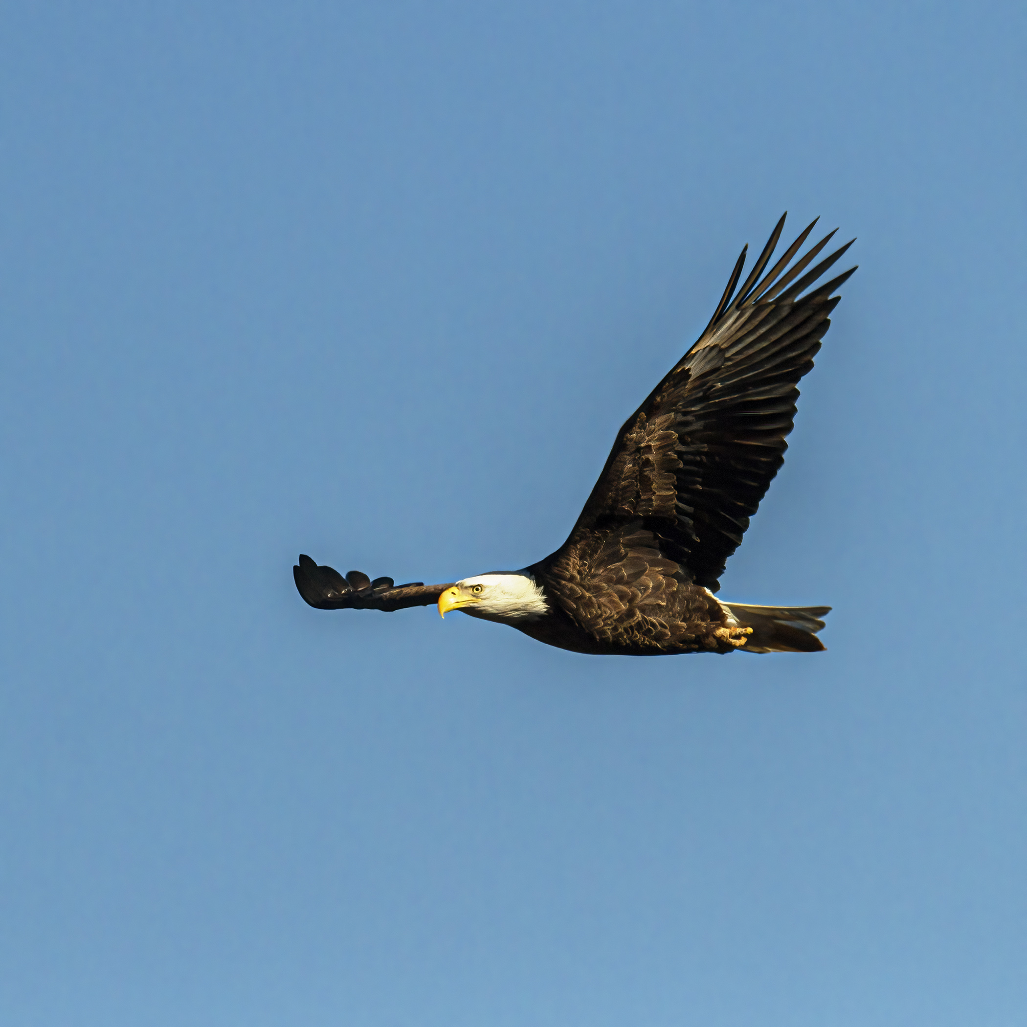 In my experience, eagles generally fly away from me or behind trees, so many of my shots of flying eagles show their tail feathers or a blurry silhouette of the eagle with branches in focus. Getting a proper exposure can be a little tricky, especially when the light is bright, and it is easy to blow out the highlights in the white head or lose feather details in the shadow areas.