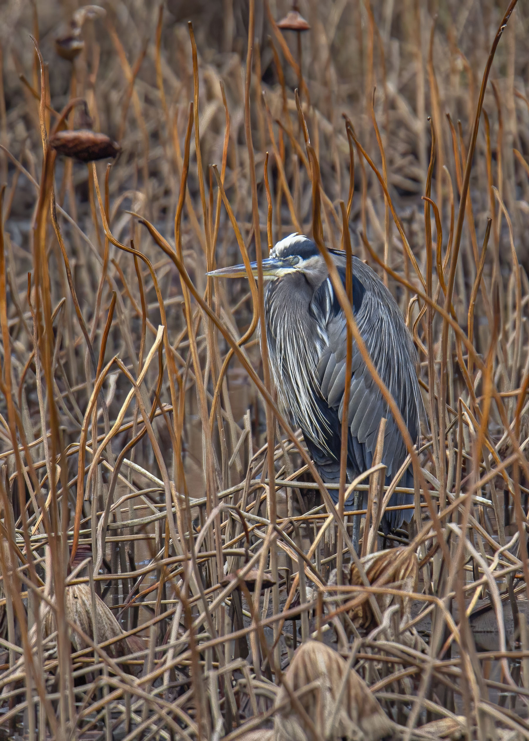 It was cold and gray and last Friday at Occoquan Bay National Wildlife Refuge. Most of the birds seemed to be inactive, like this sleeping Great Blue Heron (Ardea herodias) that was partially hidden by the vegetation in a field adjacent to a small pond.