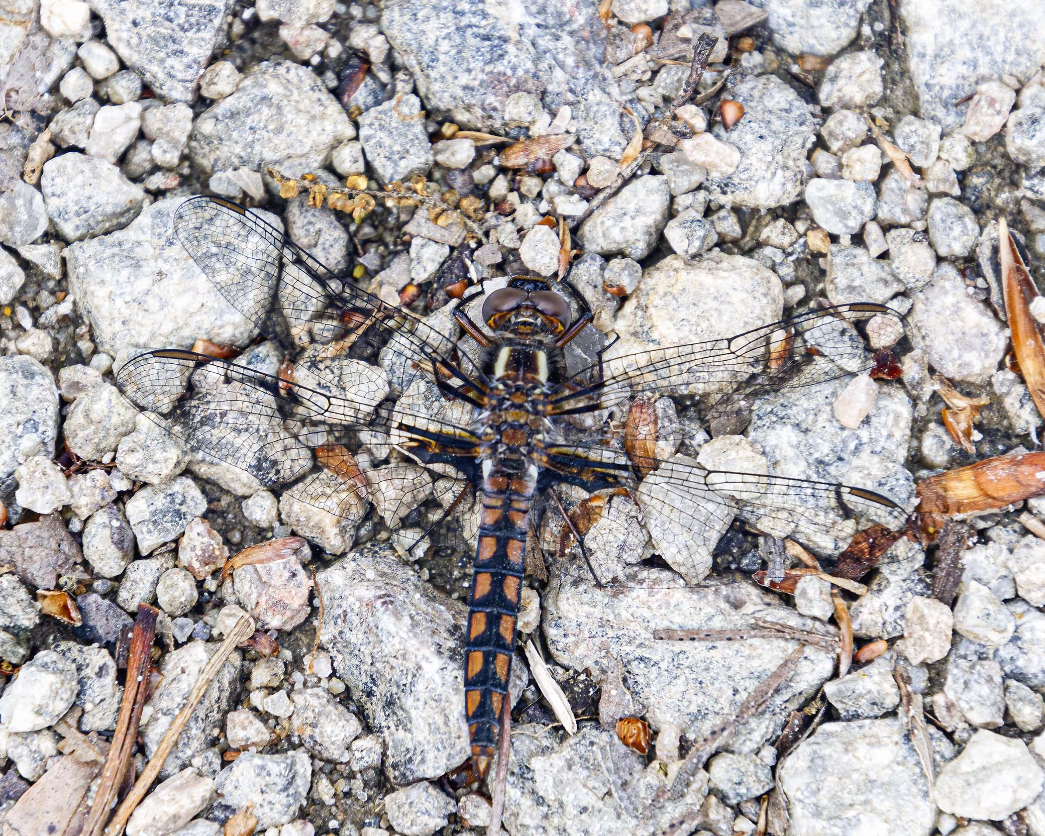 My first reaction was to stop and then to slowly bring my camera up to my eye to capture a shot before the dragonfly flew away. I was still a good distance away from the dragonfly but thanks to my telephoto lens I could see that it was a Stream Cruiser dragonfly (Didymops transversa). The final photo shows my initial view of the dragonfly. It is a little hard to tell, but the fallen branch was not very far off of the ground.