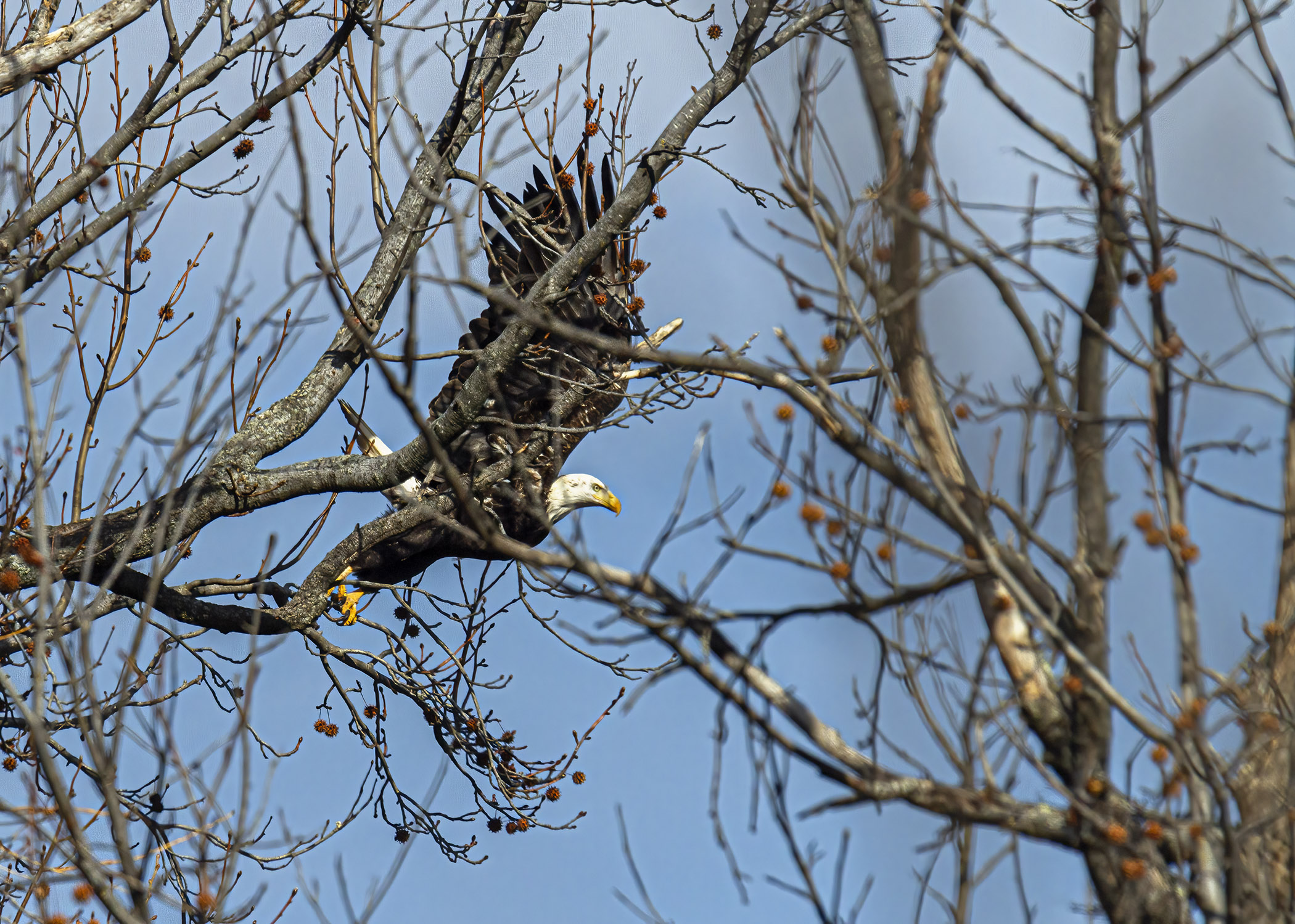 In the case of the second photo, there was a good deal of vegetation between me and the eagle that partially hid my presence. I was able to manually focus my lens on the perched eagle through the vegetation and get a relatively clear shot of the eagle, which took off almost immediately after I had snapped a couple of photos.