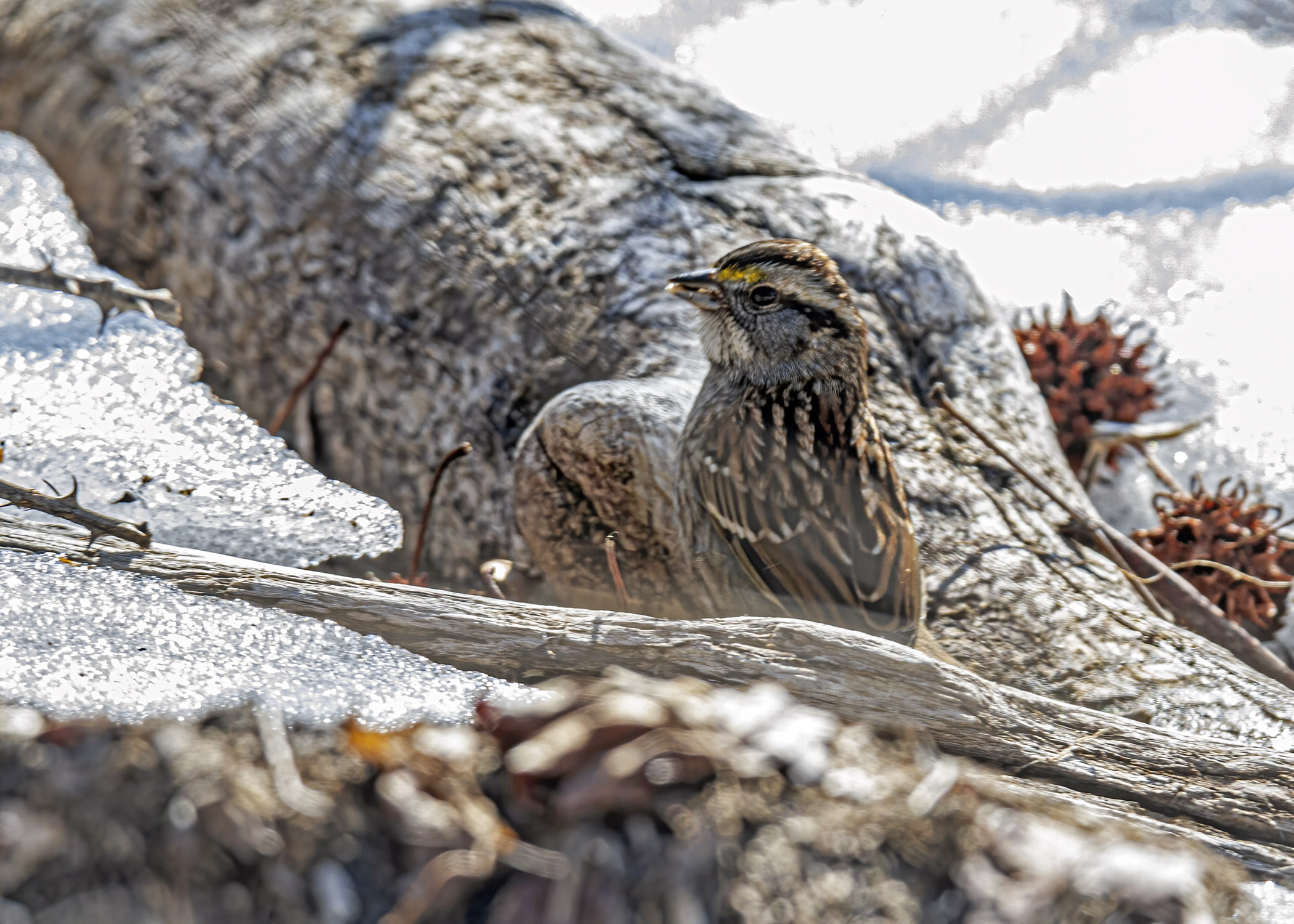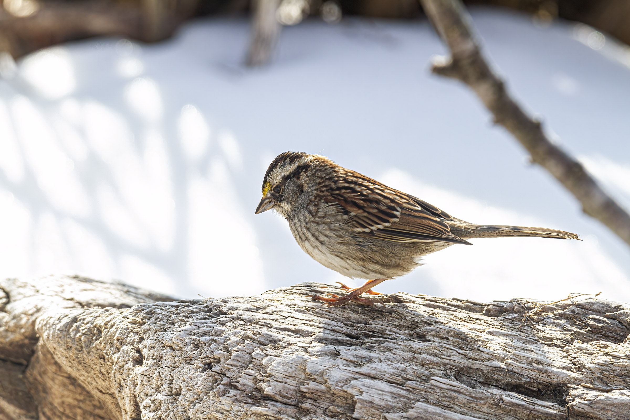 White-throated Sparrow overwinter with us, but disappear during the warmer months when they fly north to breed. One of my favorite identification features for this species is the bright yellow stripe in their lores (the area between their eyes and their bills). This particular sparrow was feverishly poking about in the snow as if foraged for food and I was particularly pleased when it hopped up onto a log and gave me a chance to capture an unobstructed shot of it.