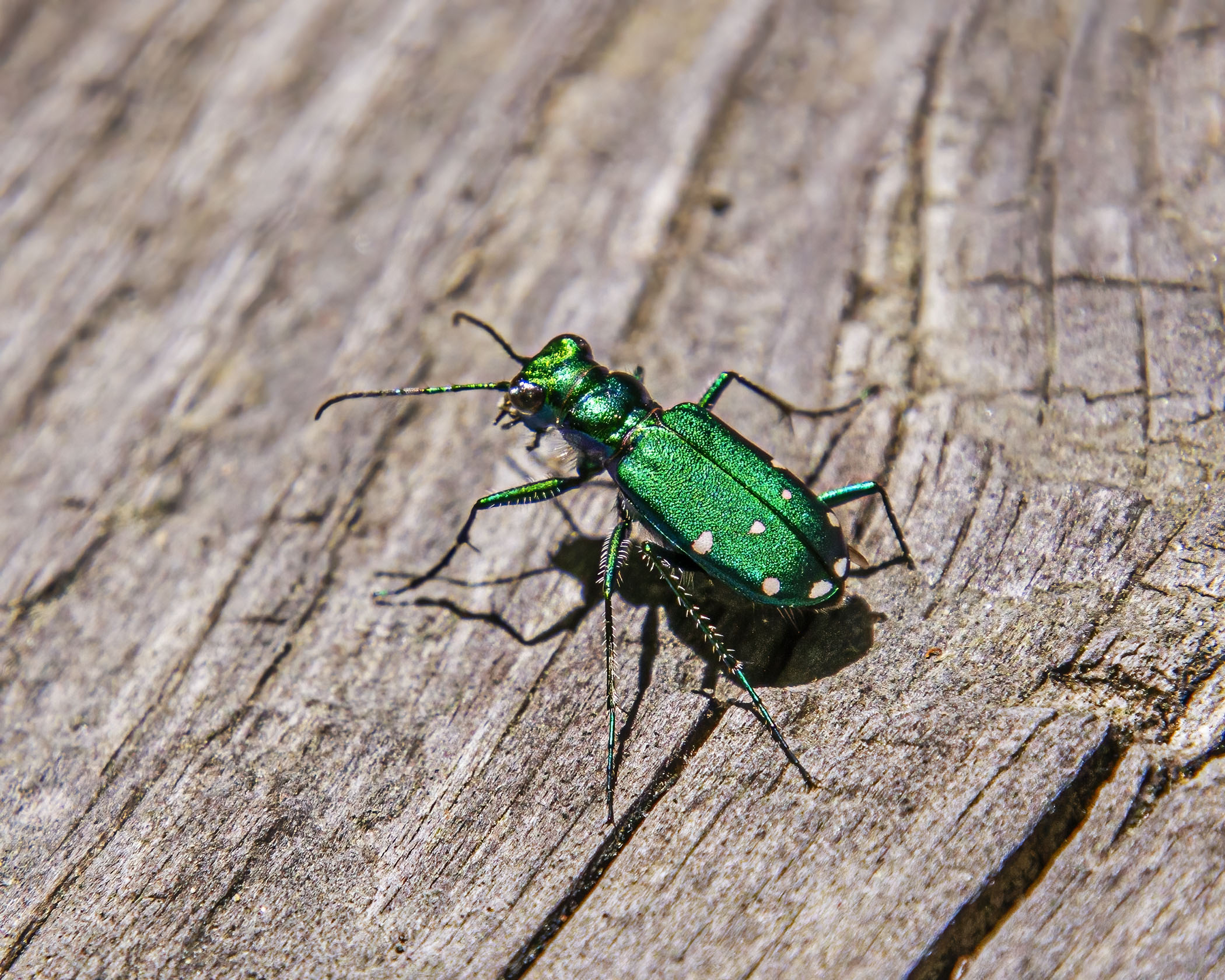 I was particularly happy with this shot, because of the way that it shows the shadow, the mouth parts, and the detailed wood grain of the stump on which the beetle was crawling. Normally these beetles, as their name suggests, have six spots, but I think that this one had eight little white spots. Apparently the number of spots is somewhat variable.