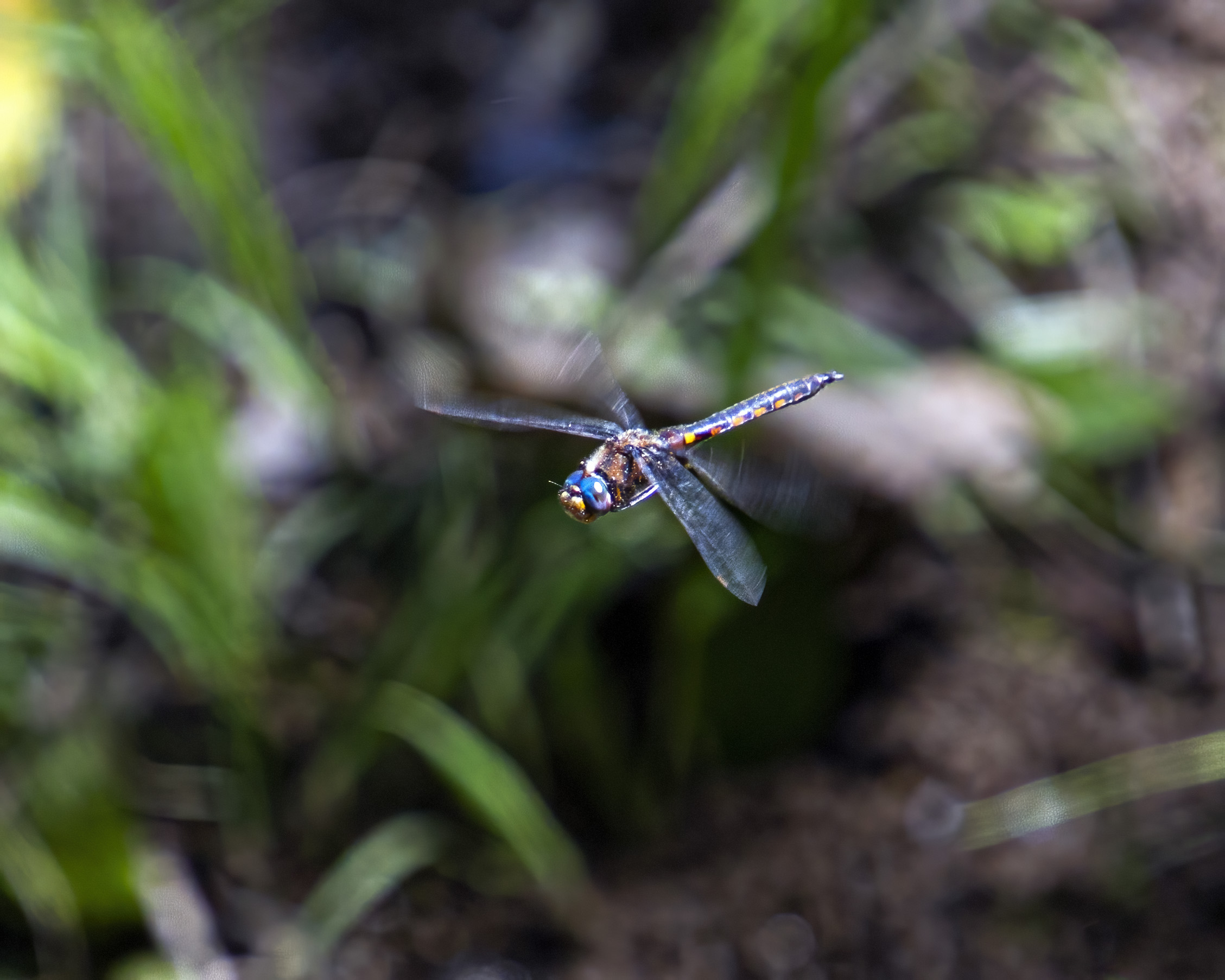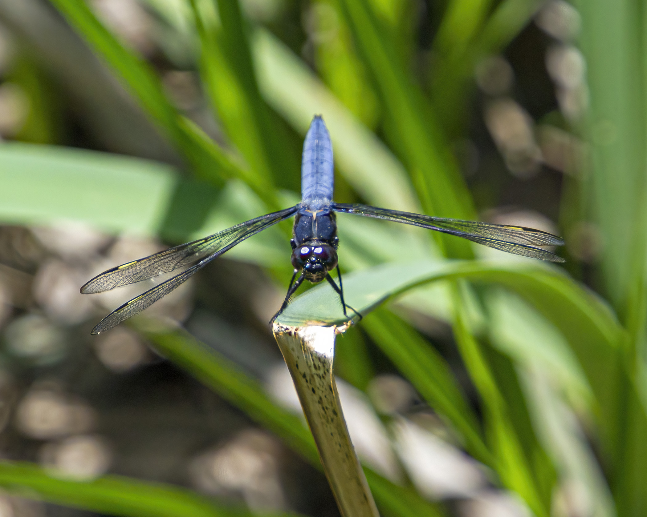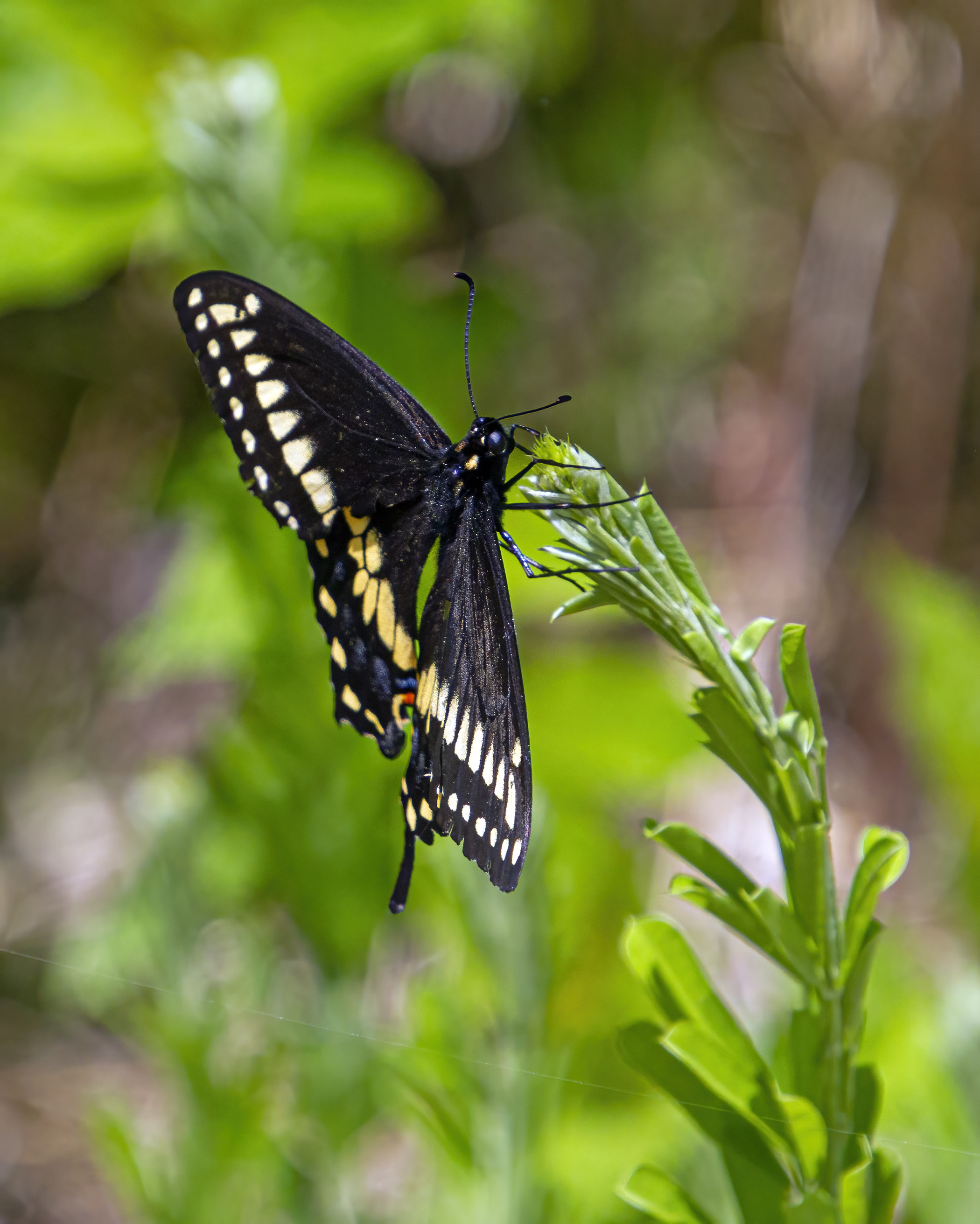 I love the markings of this beautiful butterfly and was thrilled when it held its wings open for a few seconds and let me see the stunning blue markings on its inner wings that stand out among the mostly subdued colors on its body.