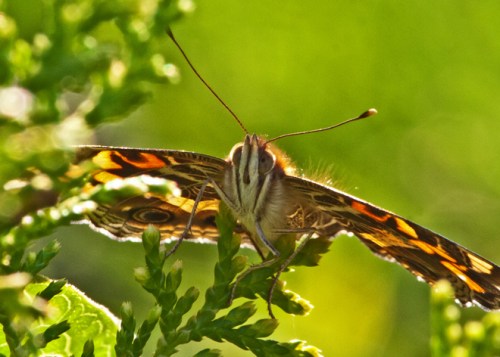 I love to try to time my butterfly photos to get shots when the wings are fully opened, revealing the butterfly’s inner beauty. In this case, though, I think that the American Lady butterfly is even more stunning when its wings are closed. Alas, I couldn’t move fast enough to get a good side shot before she flew away. The second shot at least gives you a general sense of how pretty she is.