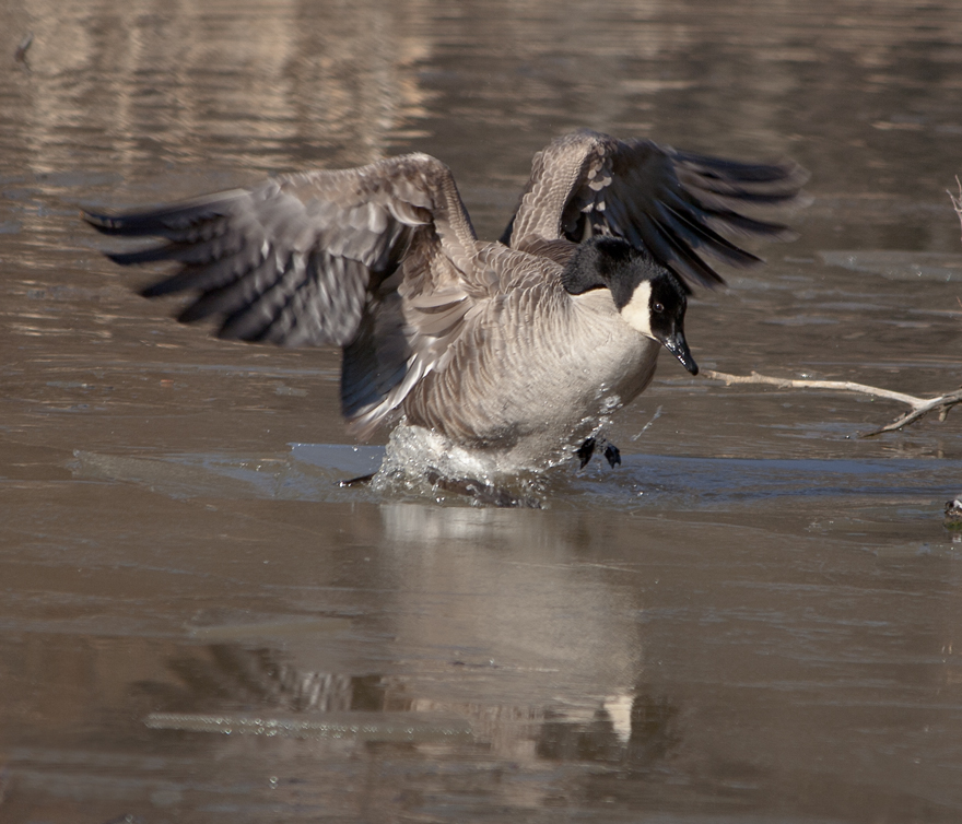 Without further delay, he flapped his wings and was able to lift himself out of the water. The photo I took of that moment is the first one shown on this blog posting and is my favorite. I am happy that I was able to capture a lot of the the details of the wings and of the ice. You can see, for example, the sheets of ice that have broken off on either side of the goose. I also like the sense of action in the position of the goose, a moment frozen in time (sorry about the obvious pun).
