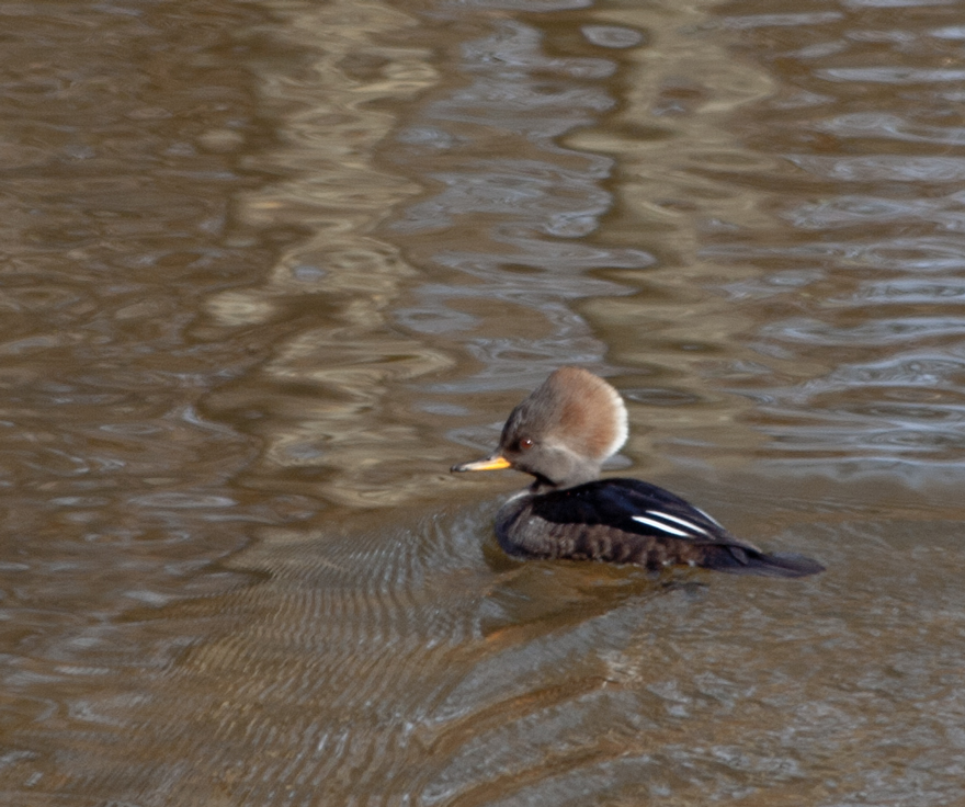 I generally have had difficulties getting good photos of Hooded Merganser ducks (Lophodytes cucullatus), because of their size, speed, and skittishness. These little ducks also hang out in different bodies of water than the Mallard Ducks and Canada Geese that I regularly feature and the little streams where they can be found are pretty inaccessible and offer obstructed views of the water.