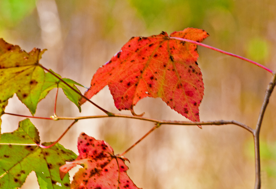 I was walking through a path in the woods when I came into a small area where the sunlight was shining directly in my eyes, providing some backlighting for these leaves that were almost at eye-level. The leaves themselves are far from being perfect specimens, speckled as they are with brown spots. For the moment, the leaves remain attached to the tree, but inevitably they will drop to the ground to join the ranks of the fallen. The colors, shapes, and textures of these leaves, however, serve as visual reminders for me of the beauty of the changing seasons, a beauty that may proclaim itself in bold swaths of spectacular color or speak with a quieter, more intimate voice.