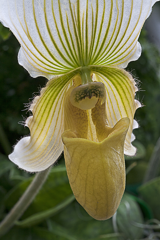 Here is a front view of a green-and-yellow Lady’s Slipper. Although the orchids were amazingly beautiful, it was often difficult to get good backgrounds for images of the flowers, because of visual clutter. I dealt with the issue by using my macro lens and concentrating on small elements of individual flowers.