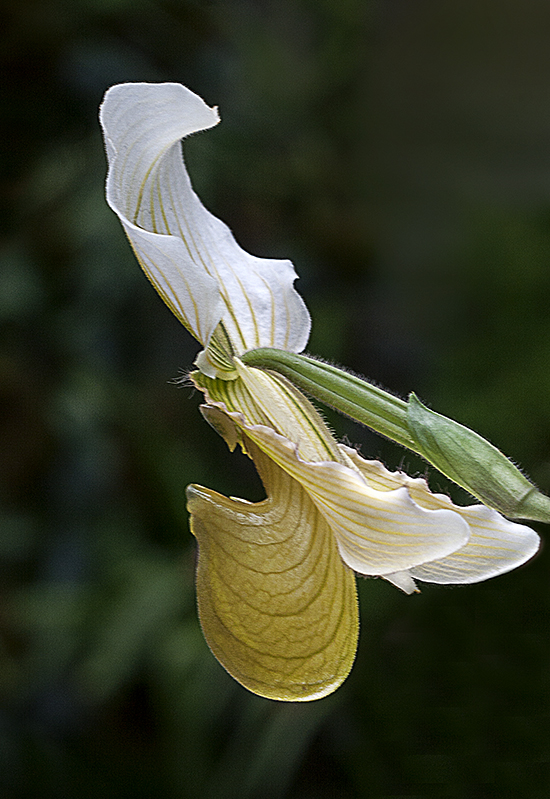 The second and third images, which provide a side view of the Lady’s Slipper, were taken with a few seconds of each other, one with the existing background and one using Cindy’s white cardboard. In many ways, I like the look of the white background—it reminds me a little of a botanical print, but it is definitely unnatural.